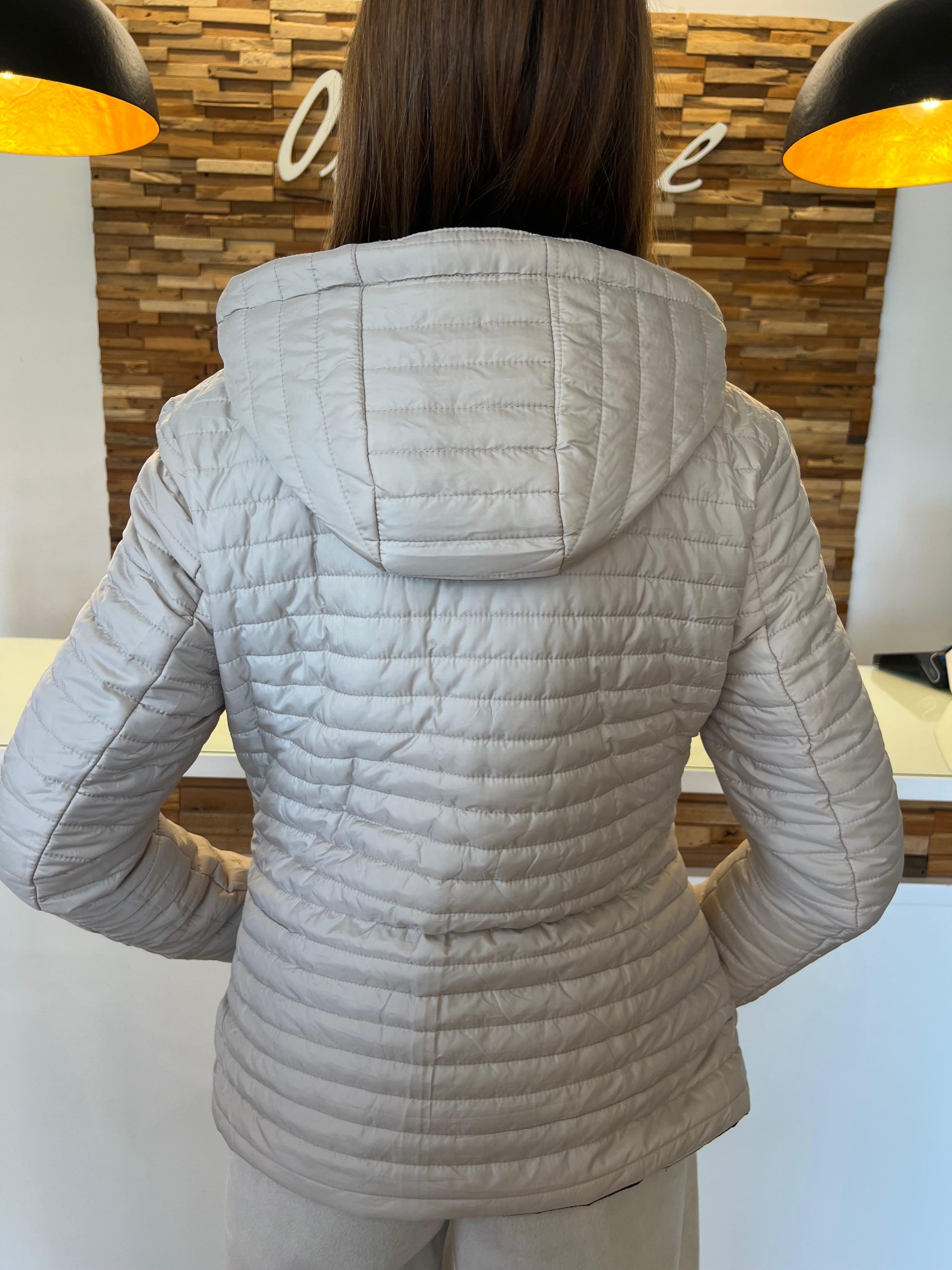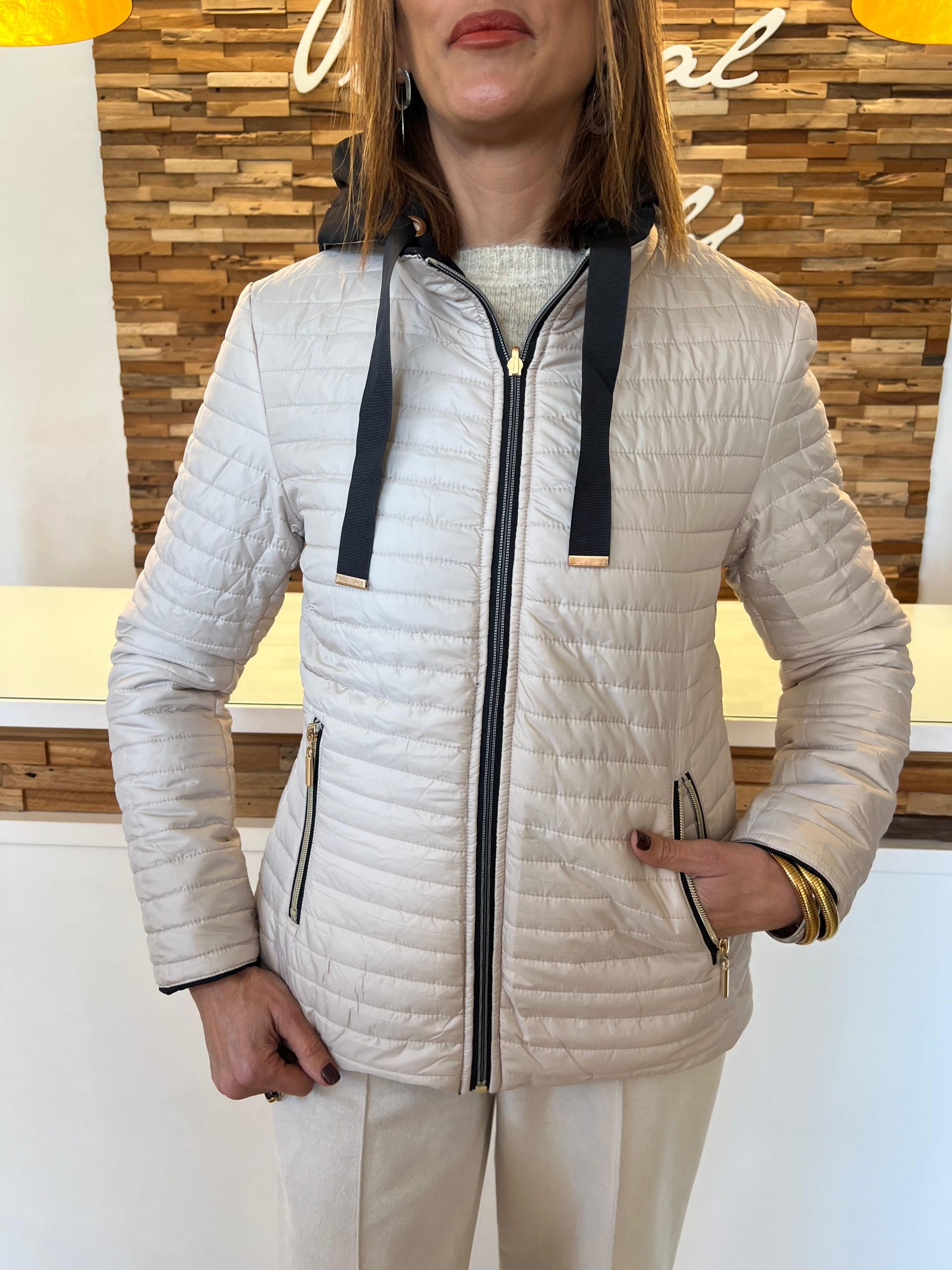 Chaqueta reversible diseñada para ofrecer versatilidad y funcionalidad en una sola prenda. Por un lado, presenta un acabado negro liso, sobrio y fácil de combinar; por el otro, un interior acolchado en color beige, que aporta un estilo más cálido y casual.