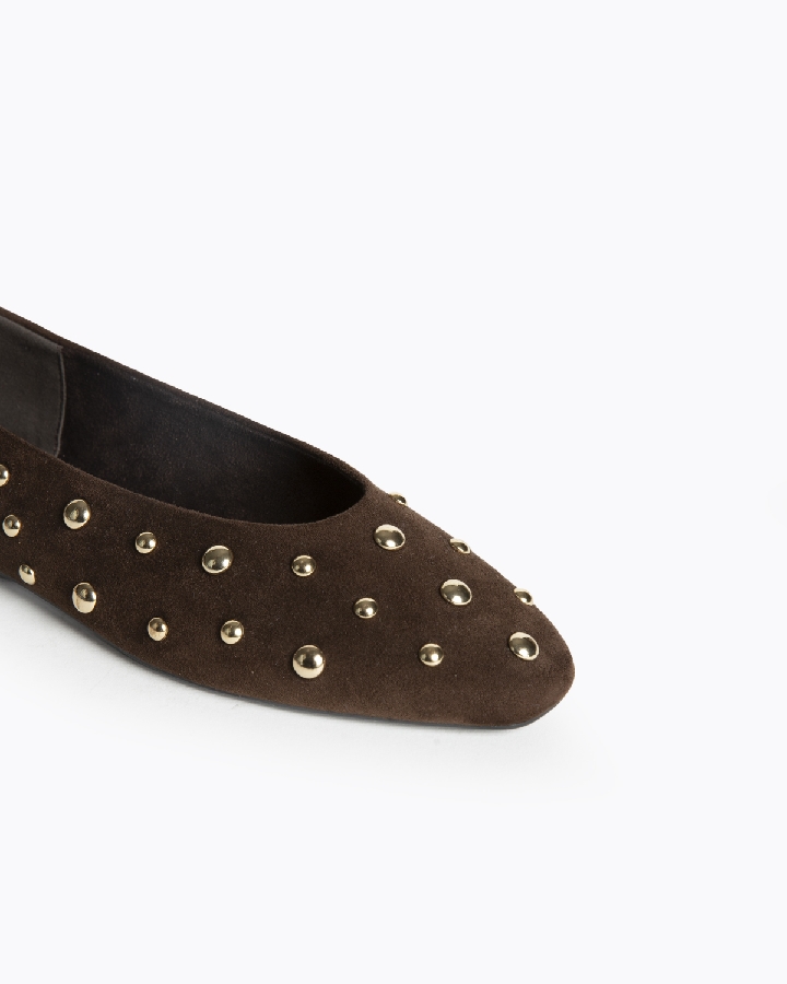 Bailarina plana. Punta redonda, escote redondo. Detalle de tachas redondas.