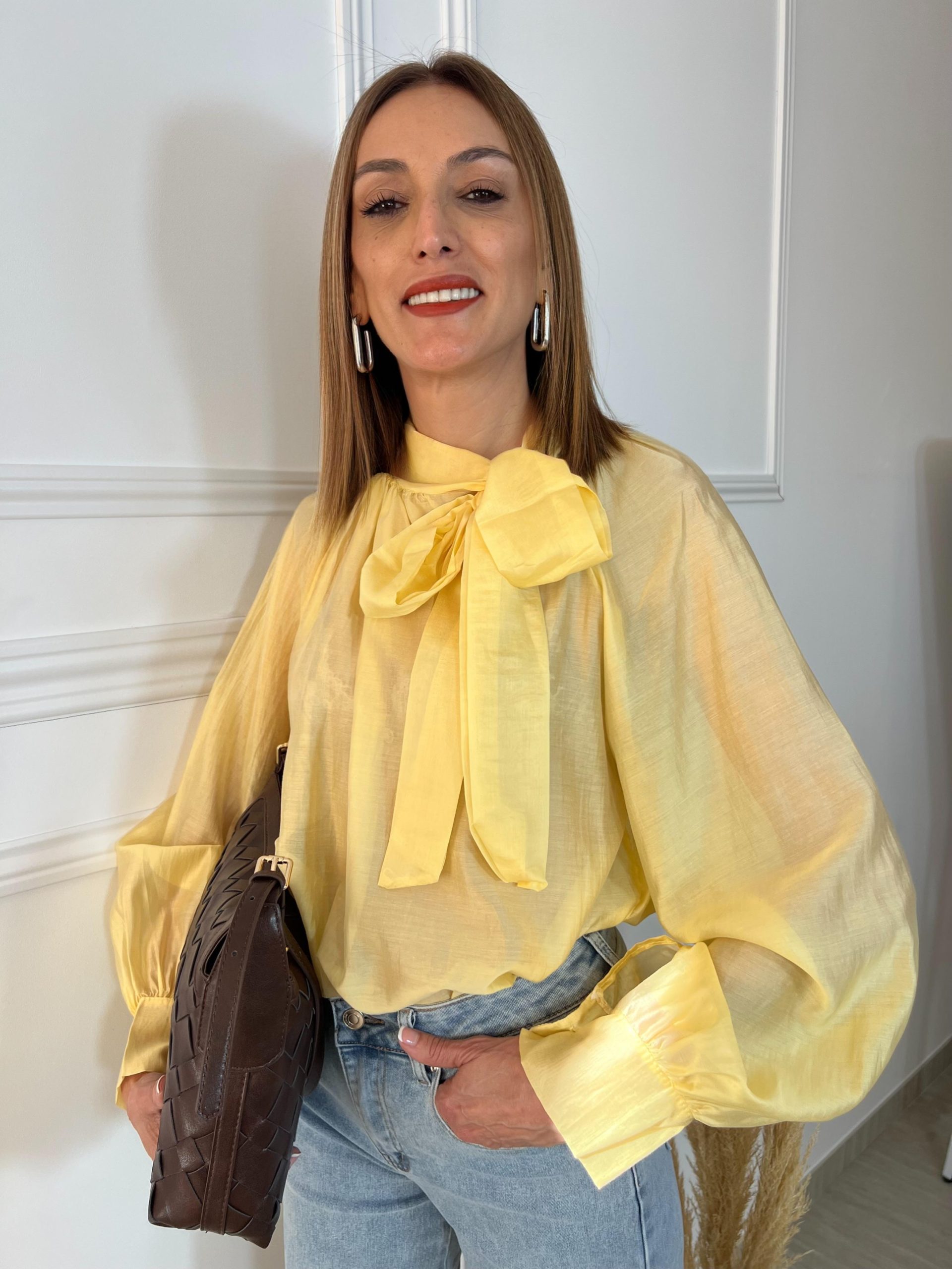 Ilumina tu guardarropa con la sofisticación etérea de nuestra blusa Soleil. Confeccionada en un tejido ligero con un sutil brillo satinado, esta prenda destaca por su volumen dramático y su color amarillo vibrante, ideal para quienes buscan una feminidad audaz y moderna.