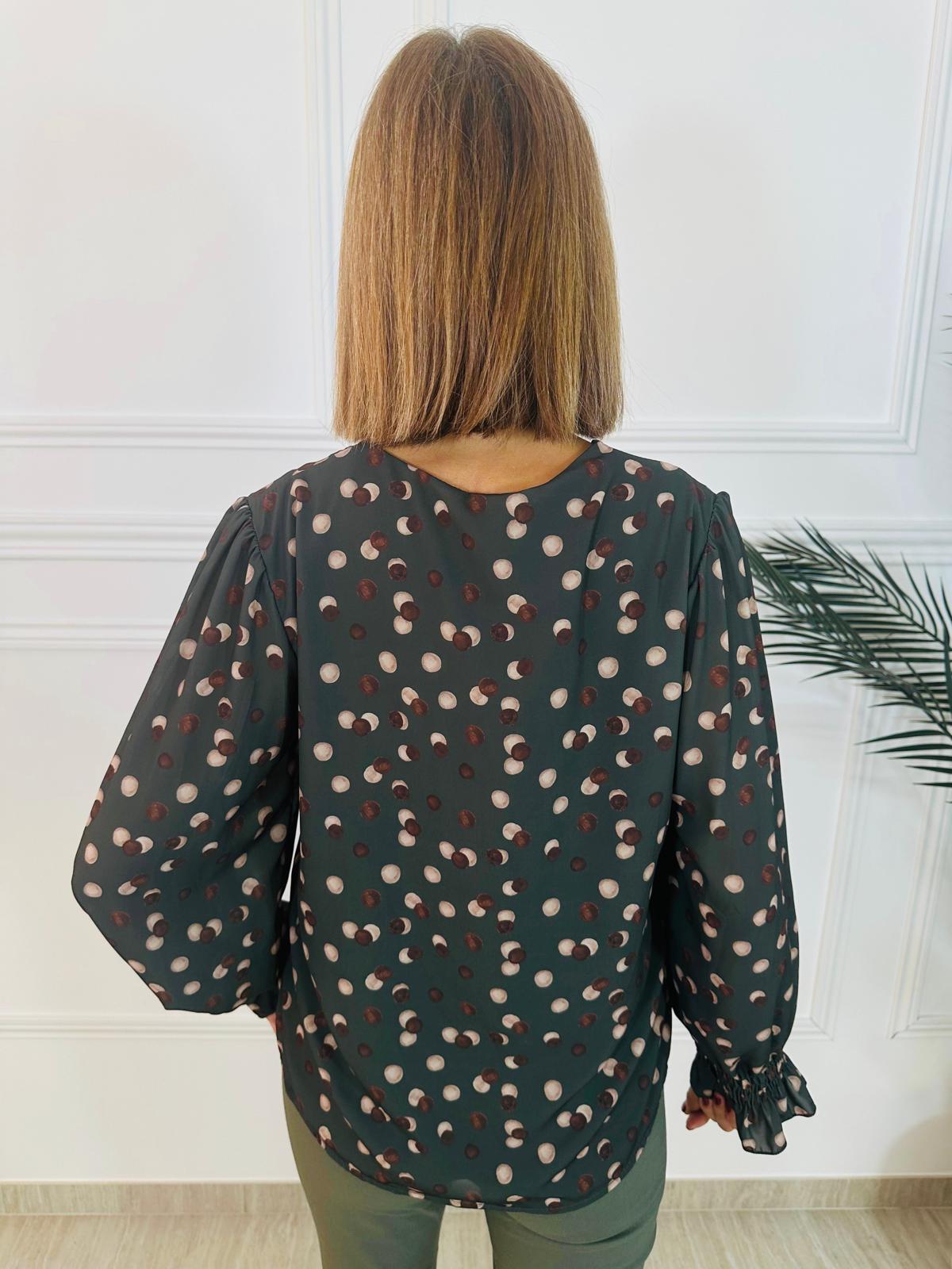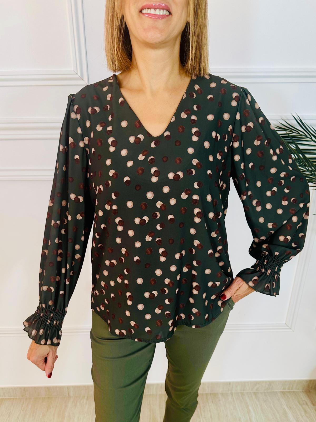 Blusa de gasa con cuello en pico. Manga larga con elástico en puño. Forro interior. Talla única.