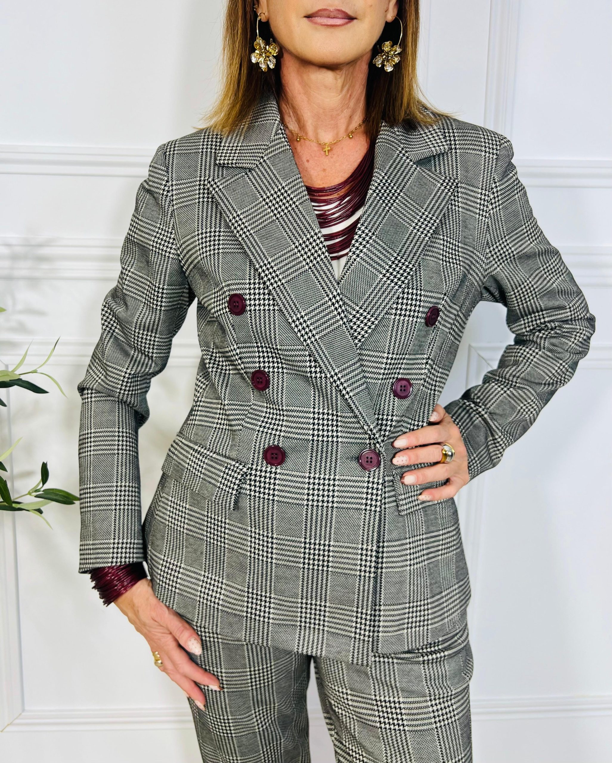Chaqueta americana cruzada estructurada de pata de gallo, con solapa y bolsillos. Con 6 botones de los cuales solo se abotona uno.
