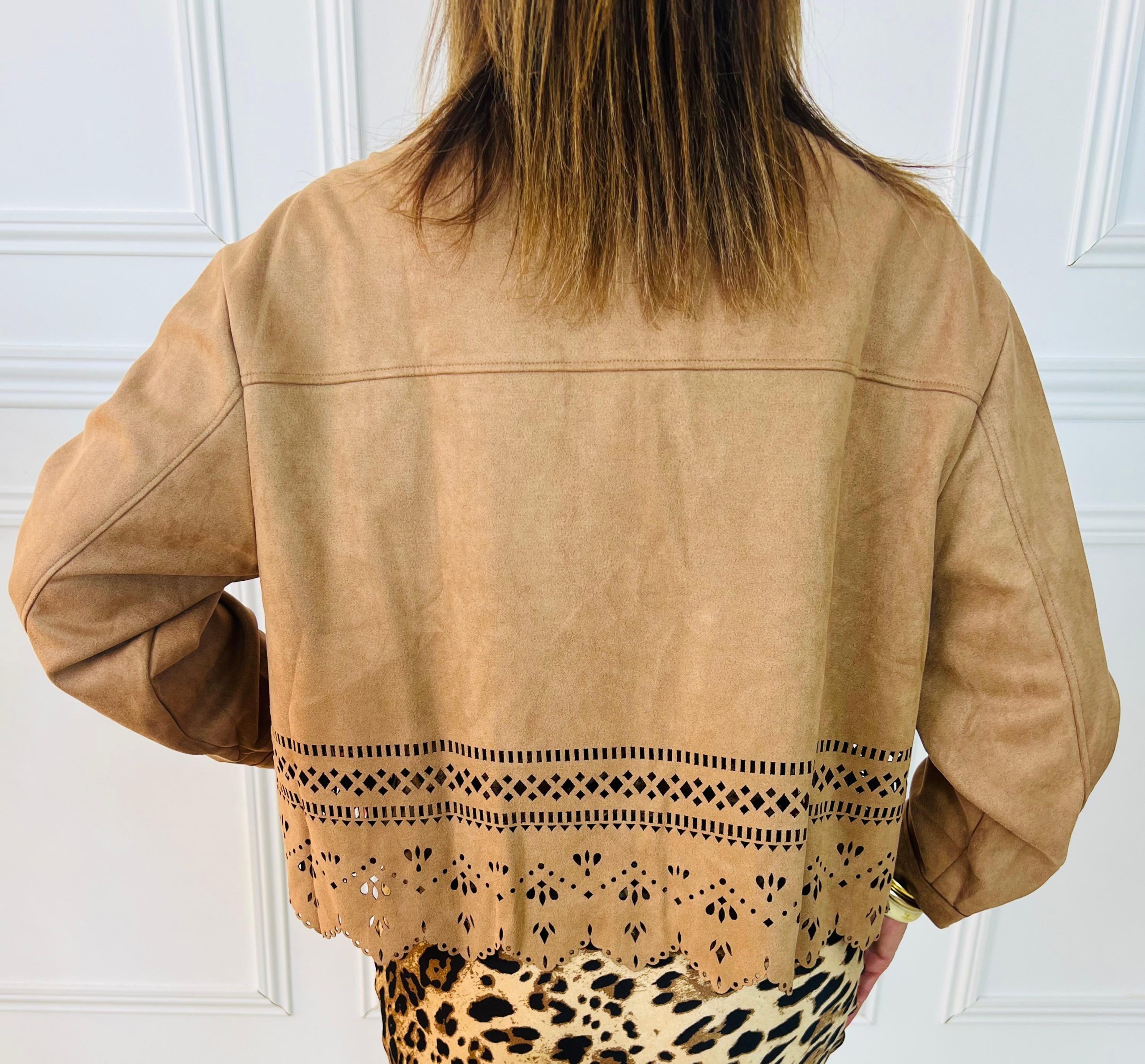 Chaqueta con efecto de ante con detalle troquelado en la parte inferior con bolsillos delanteros, cierre frontal con botones dorados y cuello solapa