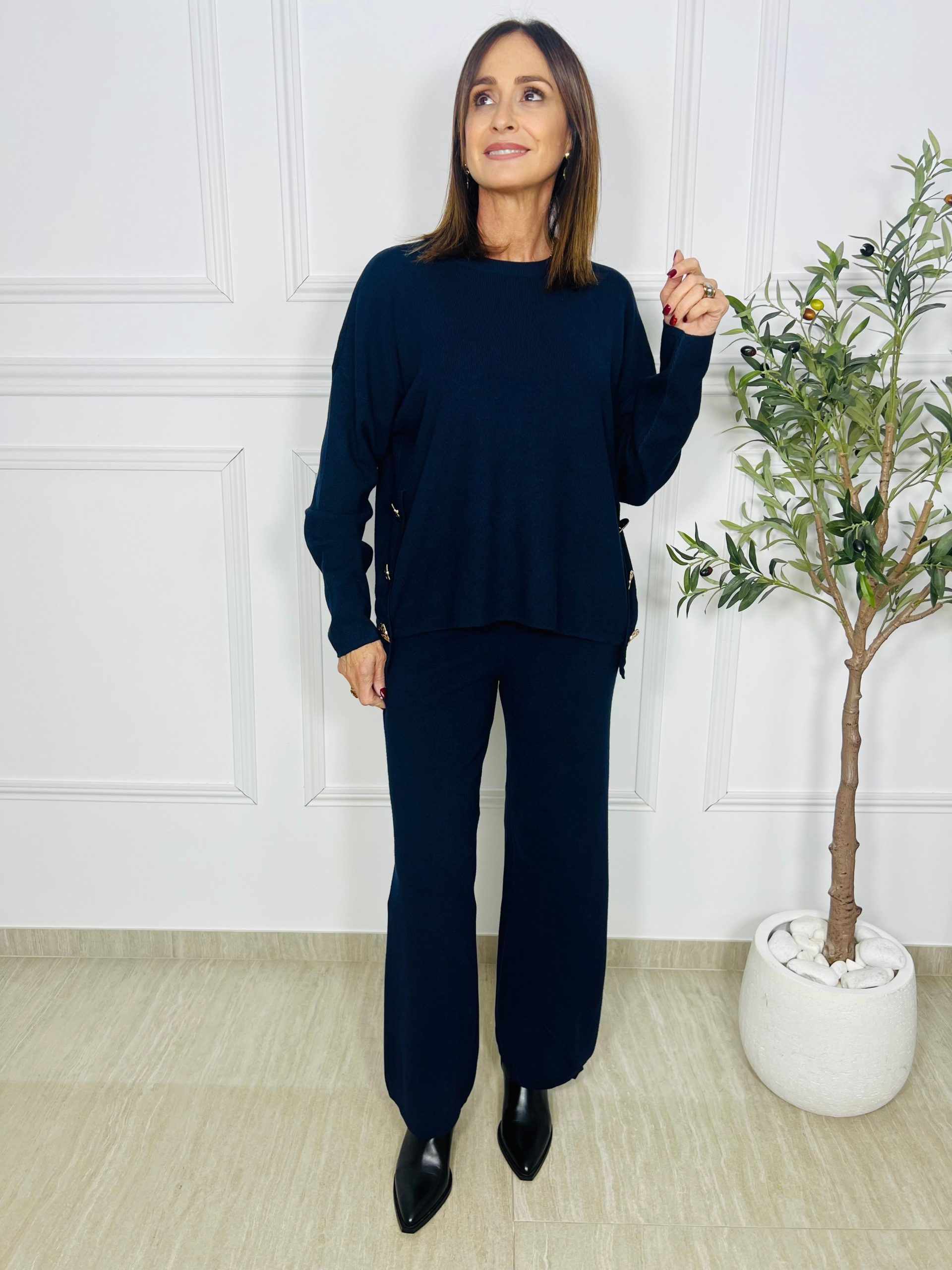 Conjunto de punto de grosor medio, ideal para llevar durante todo el año. El suéter tiene un corte ancho y cómodo, que aporta un estilo relajado y actual, con un detalle especial de tres botones grandes dorados en los laterales que le dan un toque elegante y distintivo.