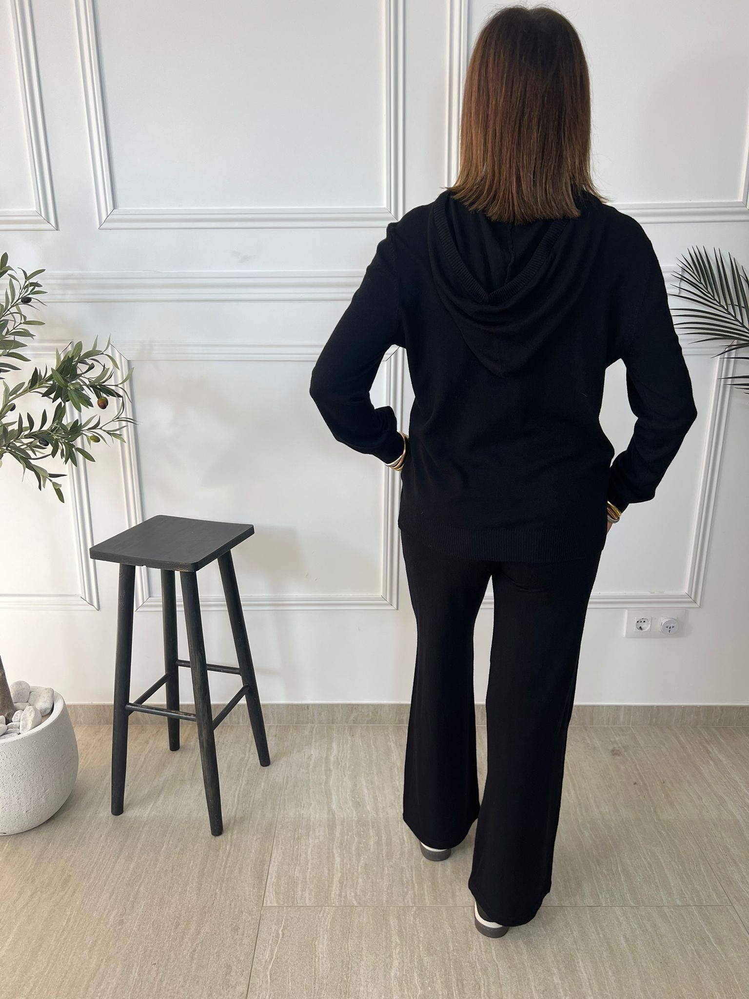 El jersey con capucha y cordones le da un aire moderno y juvenil, mientras que el pantalón de corte fluido aporta movimiento y comodidad sin perder elegancia.
