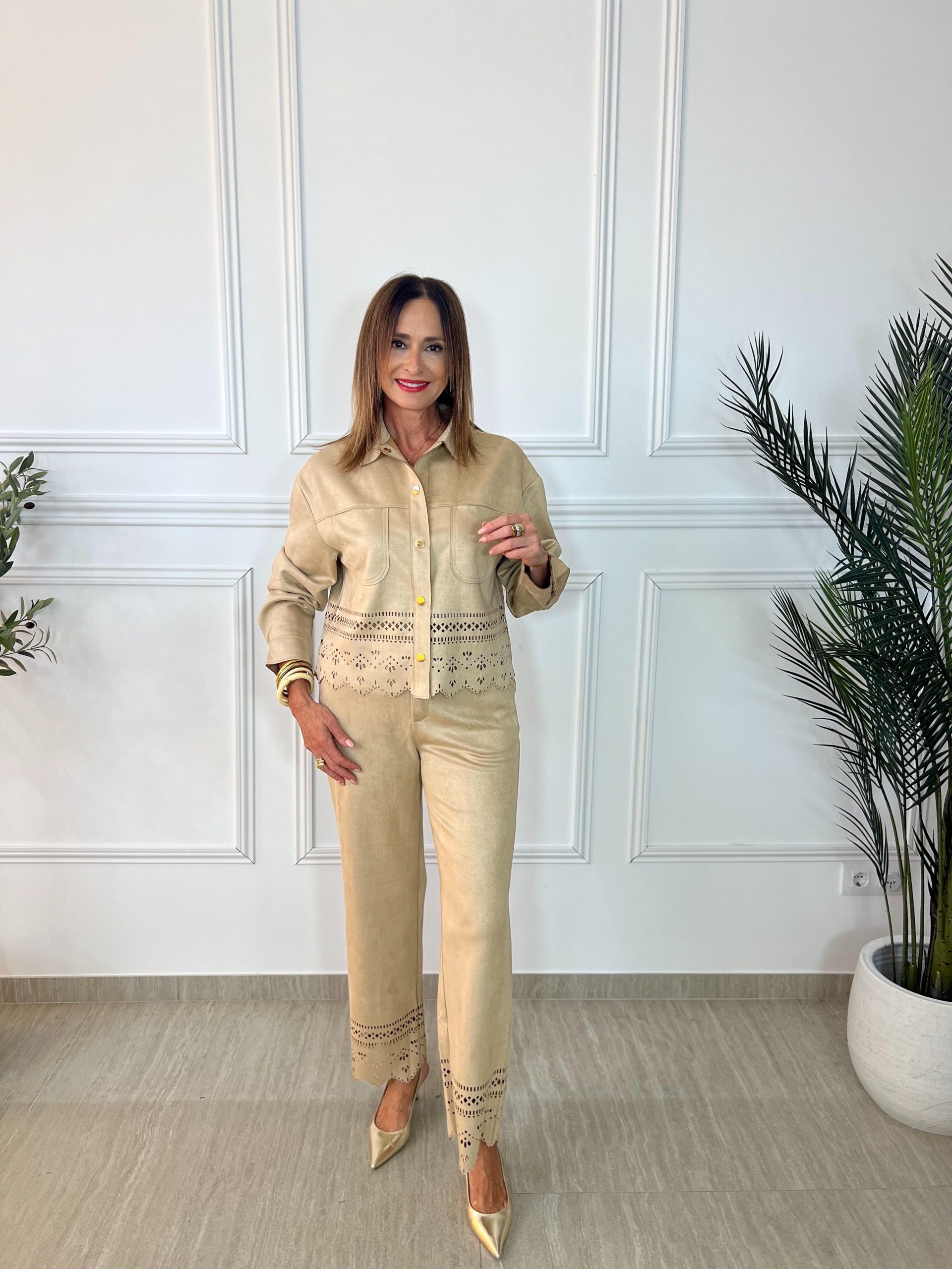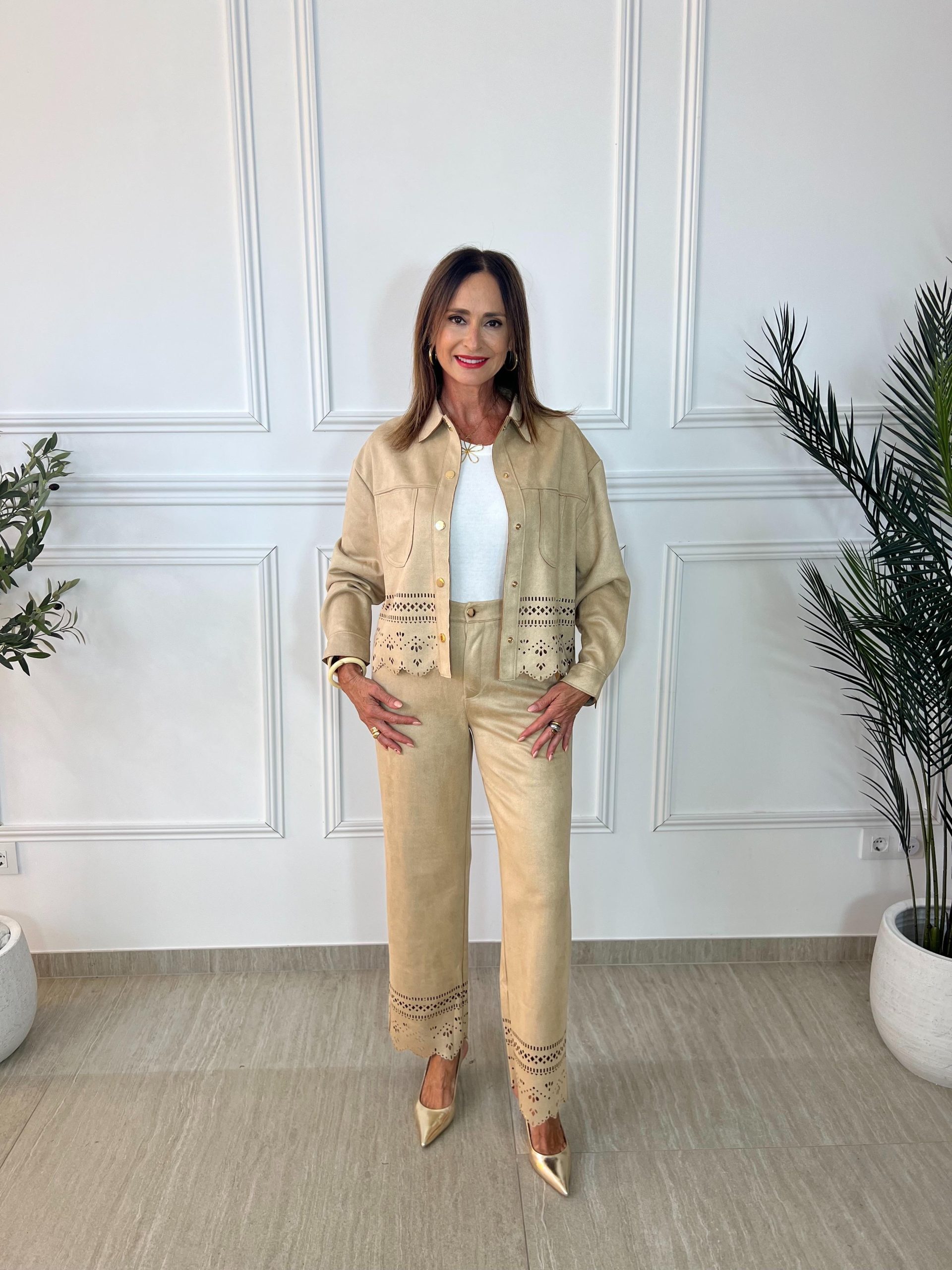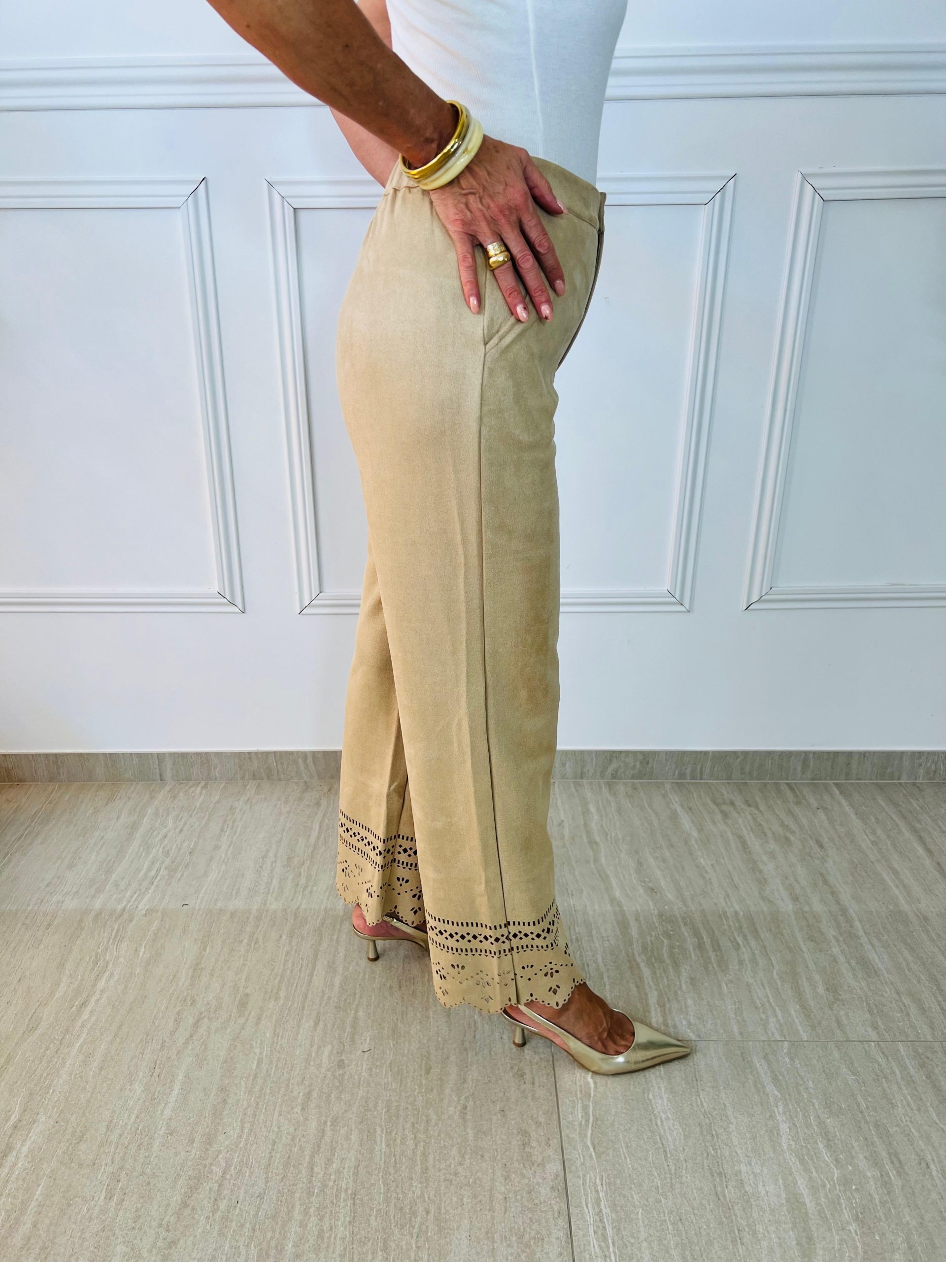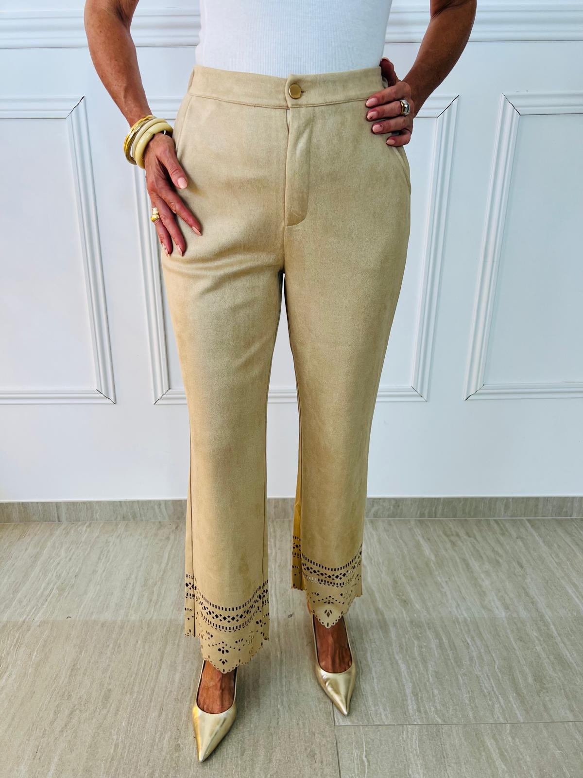 - Pantalones rectos acabados con detalle troquelado, cintura elástica, con bolsillos y cierre frontal con cremallera y botón dorado.