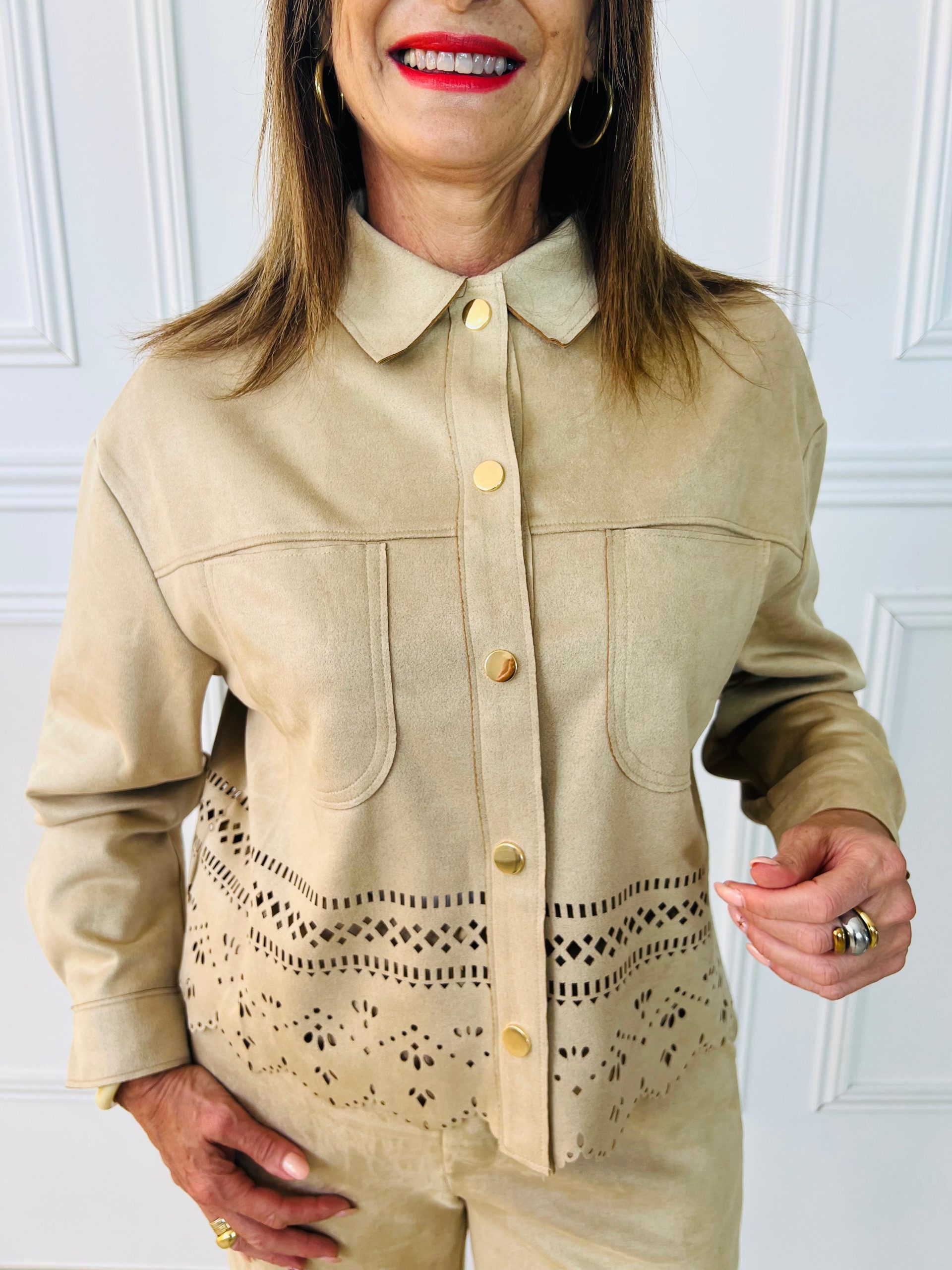 - Chaqueta con acabado en detalle troquelado con bolsillos delanteros y cierre frontal con botones dorados