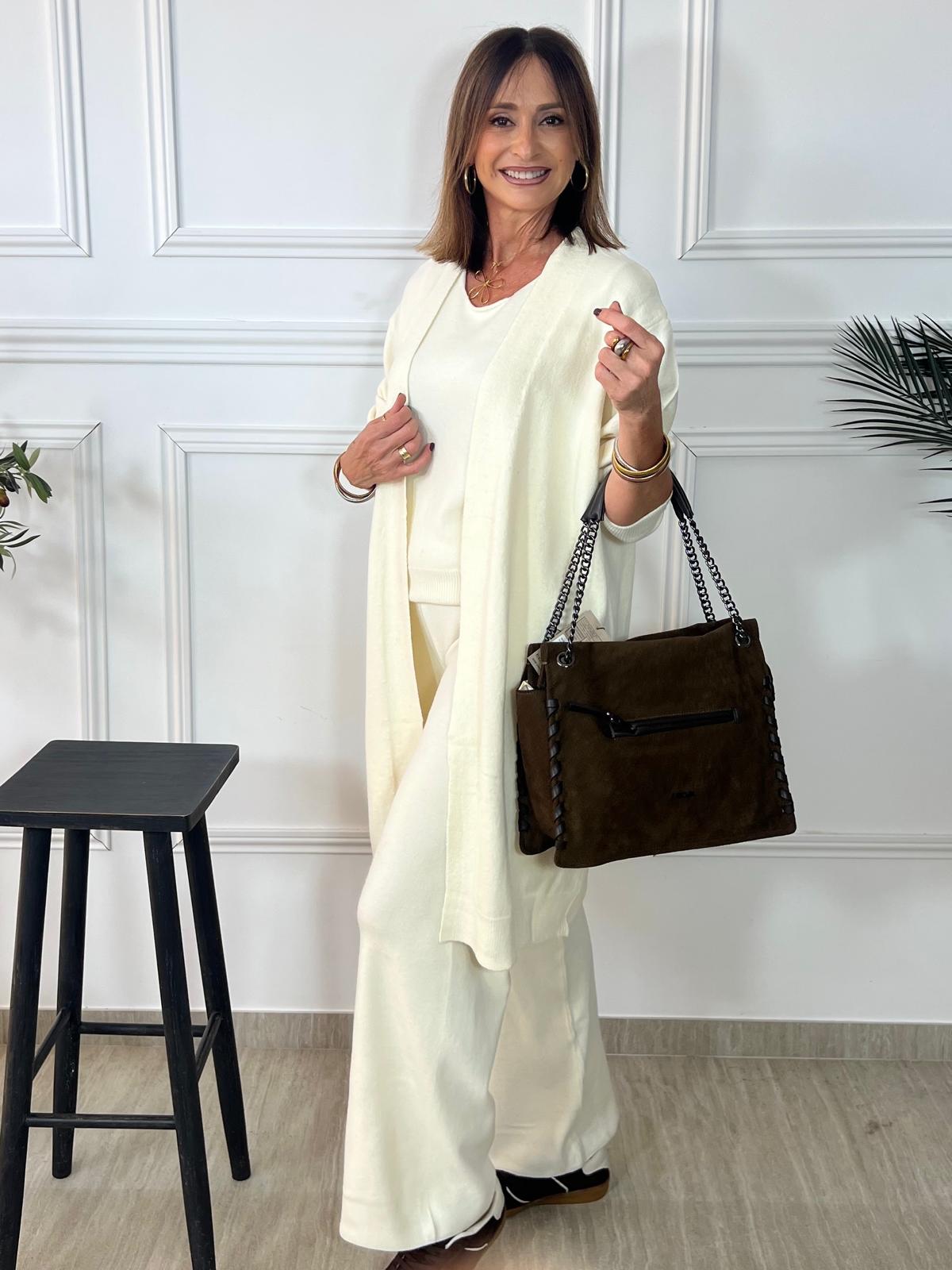 El pantalón fluido y el jersey básico se acompañan de un cárdigan largo que aporta un toque de sofisticación sin renunciar a la comodidad.