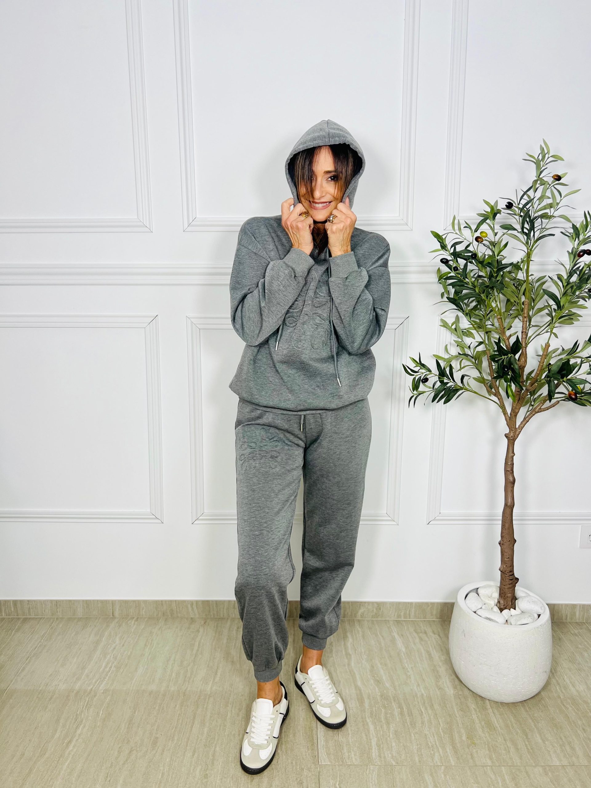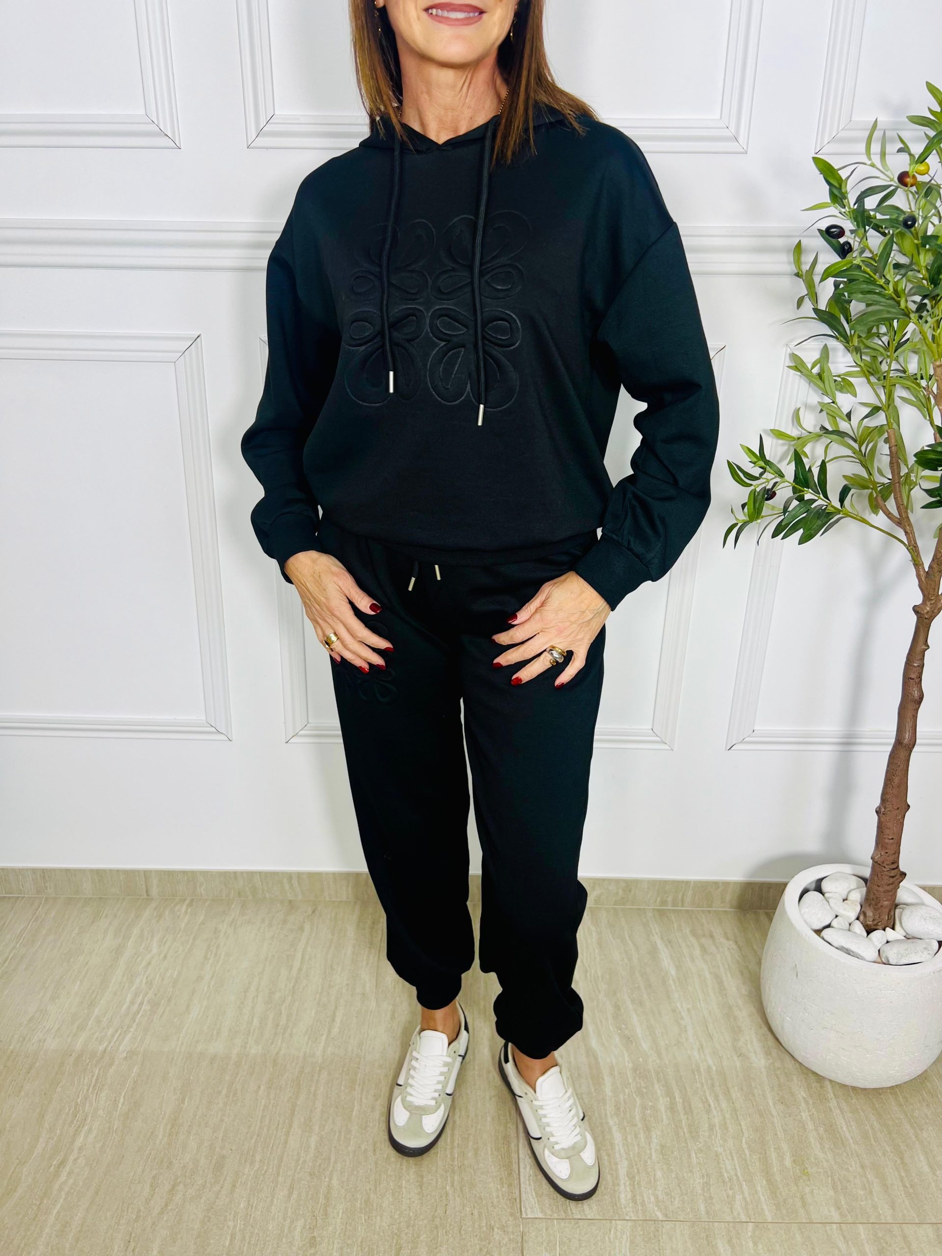 Chándal de algodón de dos piezas, diseñado para ofrecer comodidad sin renunciar al estilo. La sudadera cuenta con capucha y acabado con goma tanto en los puños como en la parte inferior, lo que aporta un ajuste cómodo y actual. Como detalle distintivo, incorpora un dibujo en relieve que añade textura y un toque moderno al diseño.
