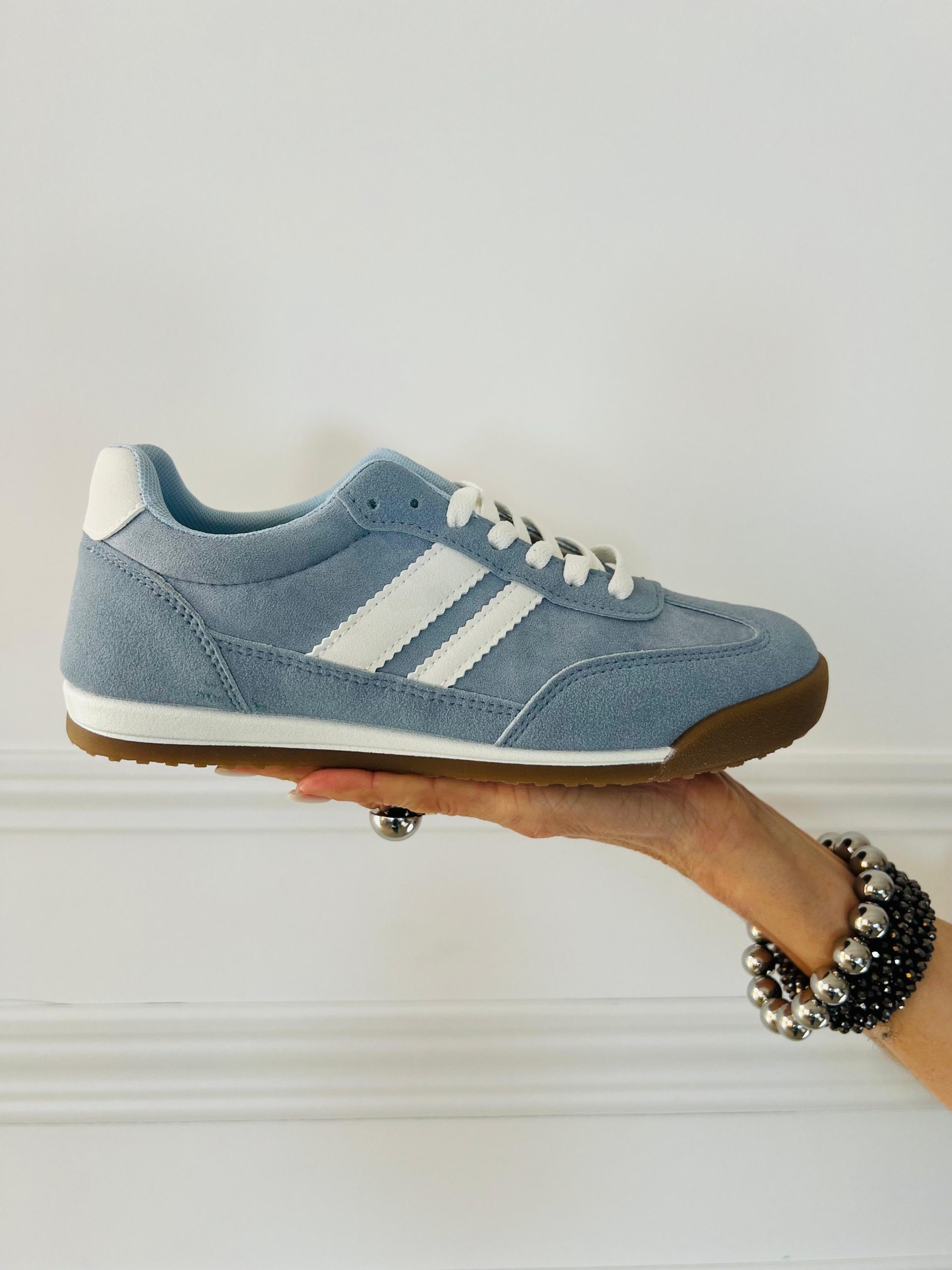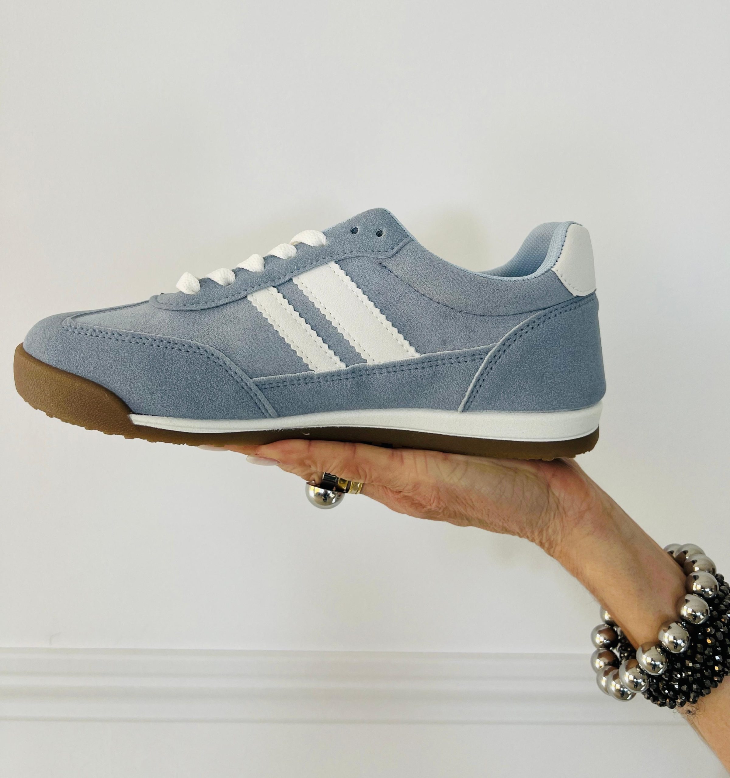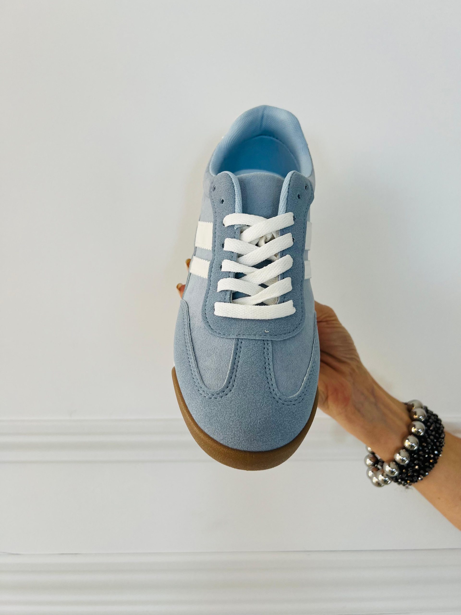 Deportiva de estilo urbano en tono azul con detalles en blanco que aportan un contraste limpio y moderno. Su diseño de líneas clásicas se combina con una silueta baja y versátil, perfecta para looks casuales con un toque actual. La suela en tono caramelo añade personalidad y un aire retro, mientras que el ajuste con cordones brinda comodidad y firmeza en cada paso. Ideal para el día a día, esta zapatilla equilibra estilo, confort y facilidad para combinar con jeans, faldas o vestidos informales.