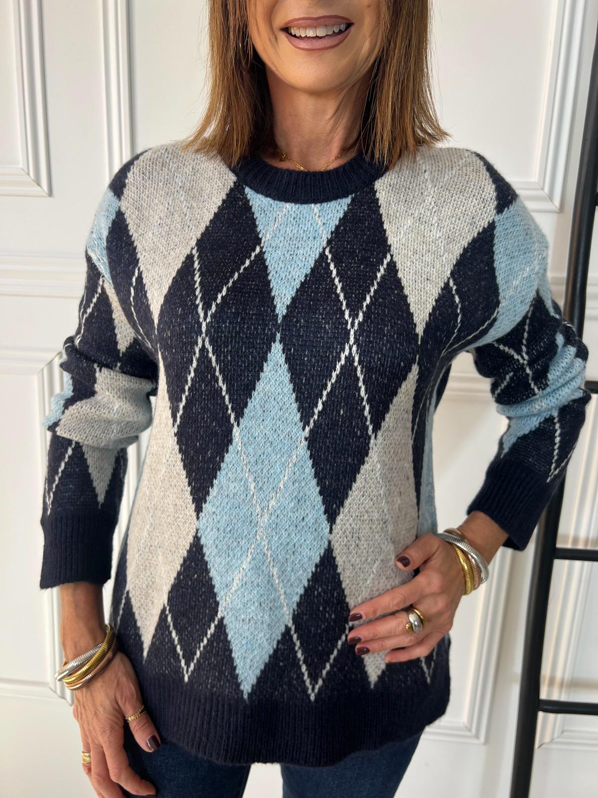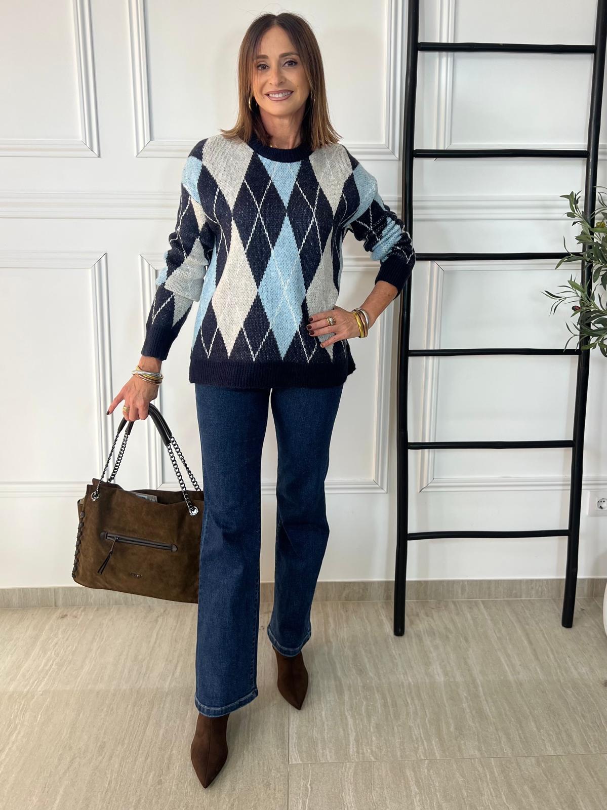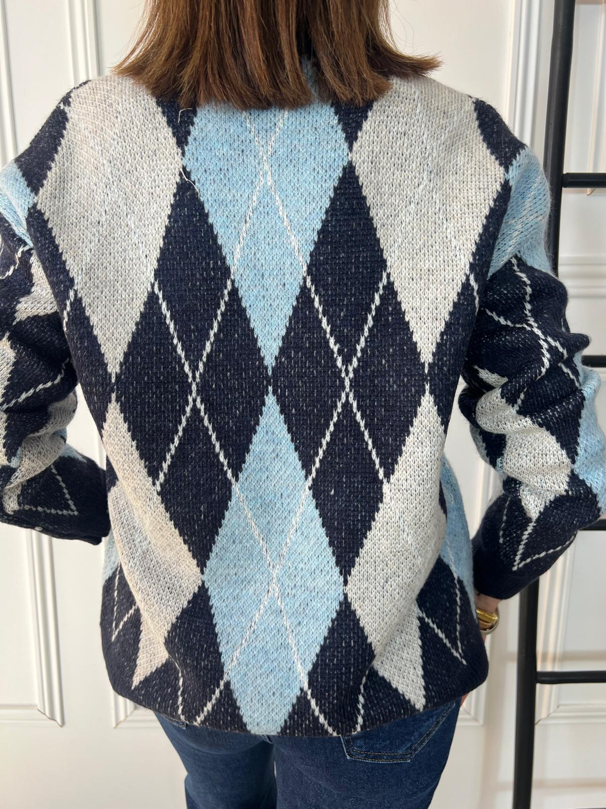 Clásico y atemporal, este suéter de lana con diseño de rombos aporta calidez y estilo a tus looks de temporada. Su textura suave y agradable al tacto lo convierte en una prenda imprescindible para los días más fríos. Combínalo con unos vaqueros para un aire casual o con una falda midi para un toque más sofisticado. Un básico con encanto que nunca pasa de moda.
