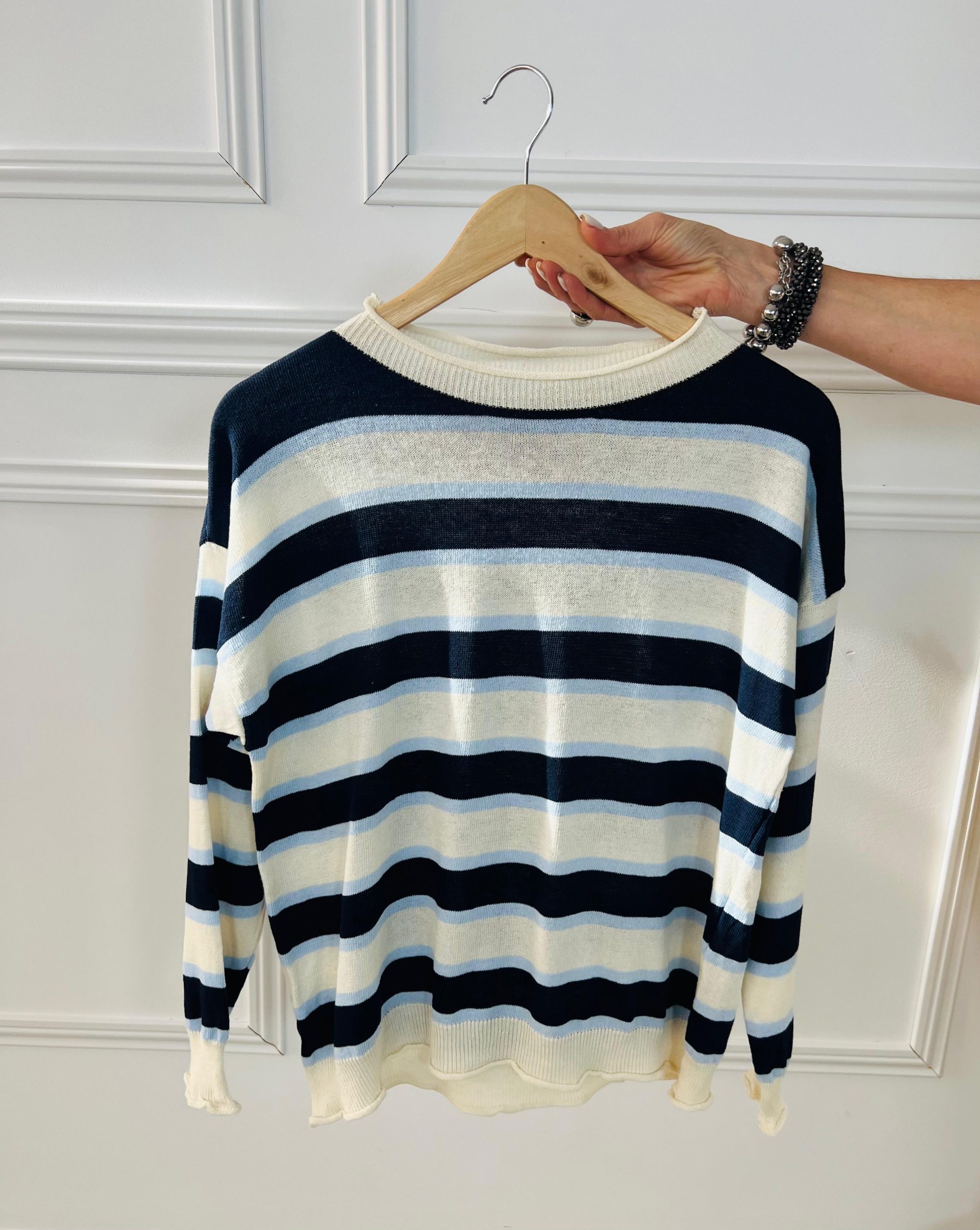 Este jersey de punto ligero es la combinación perfecta de frescura y estilo. Diseñado con un clásico patrón de rayas horizontales, está disponible en dos variantes de color que se adaptan a cualquier ocasión: una opción en azul marino, blanco y celeste para un look náutico atemporal, y otra en blanco, celeste y dorado para quienes buscan un toque de luminosidad y brillo.