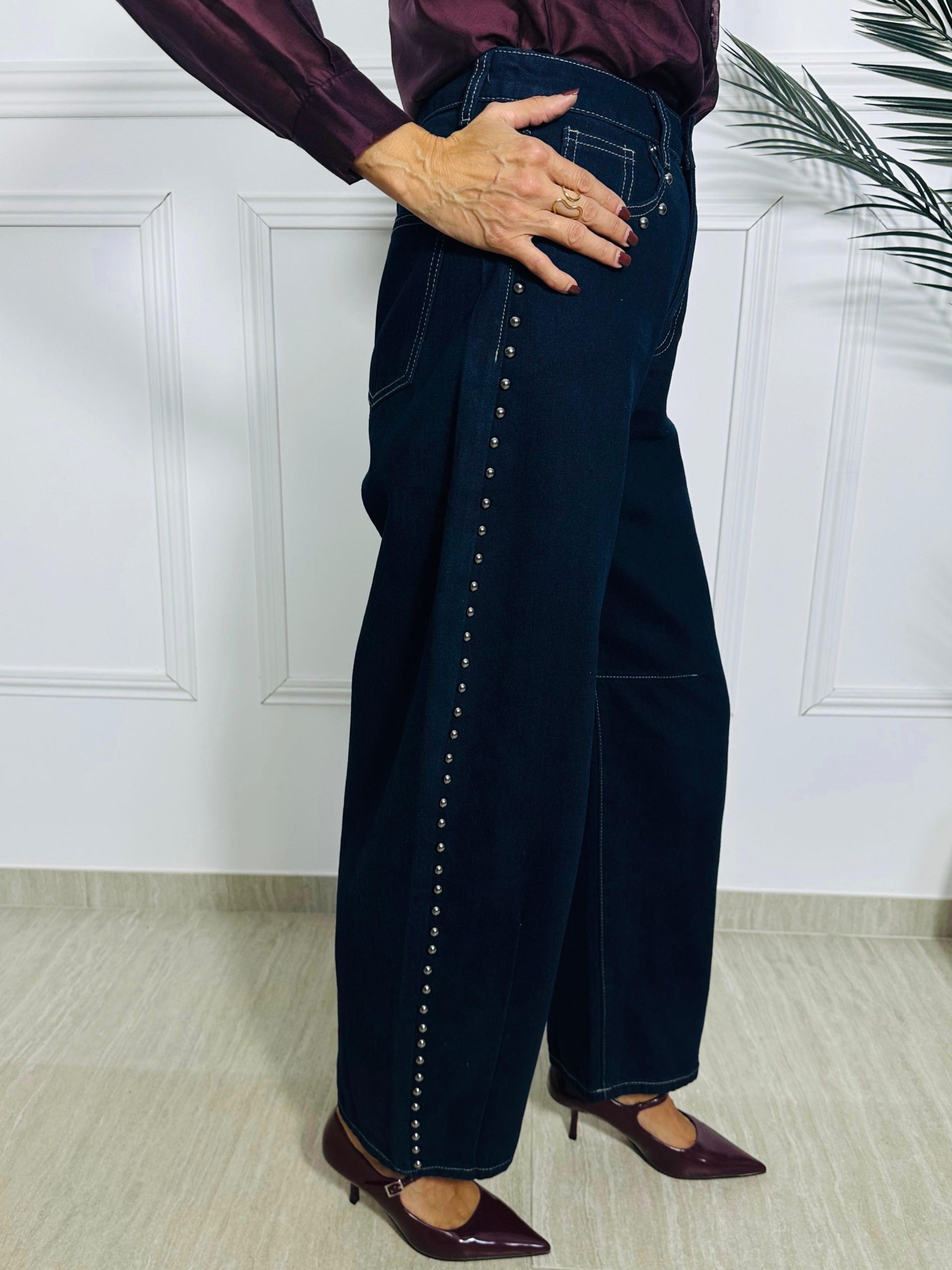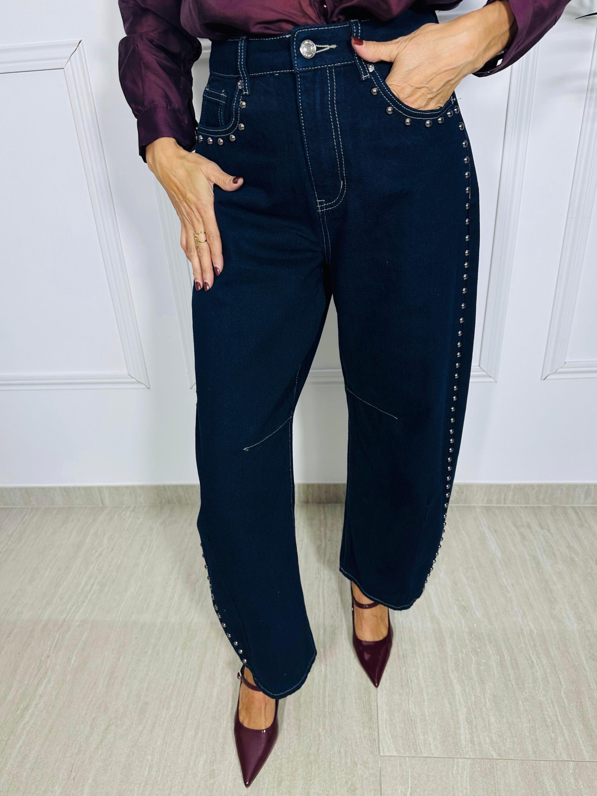 Jeans de tiro alto y cinco bolsillos. Detalle tachuelas en los laterales. Cierre frontal con cremallera y botón metálico.