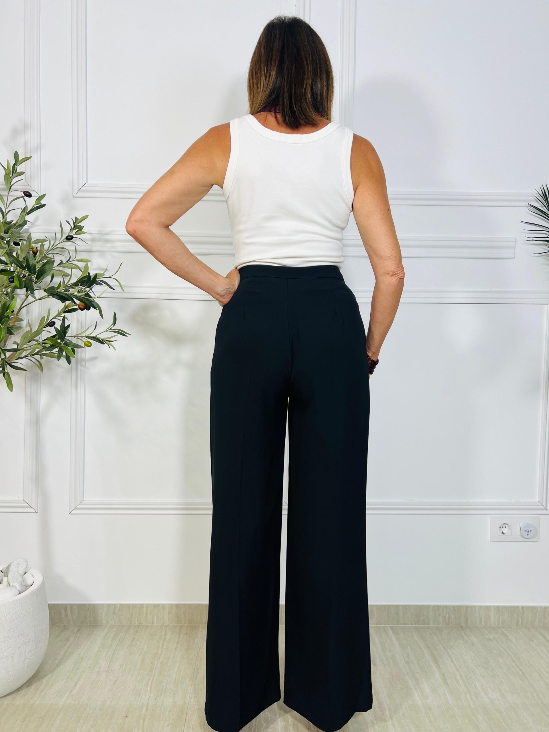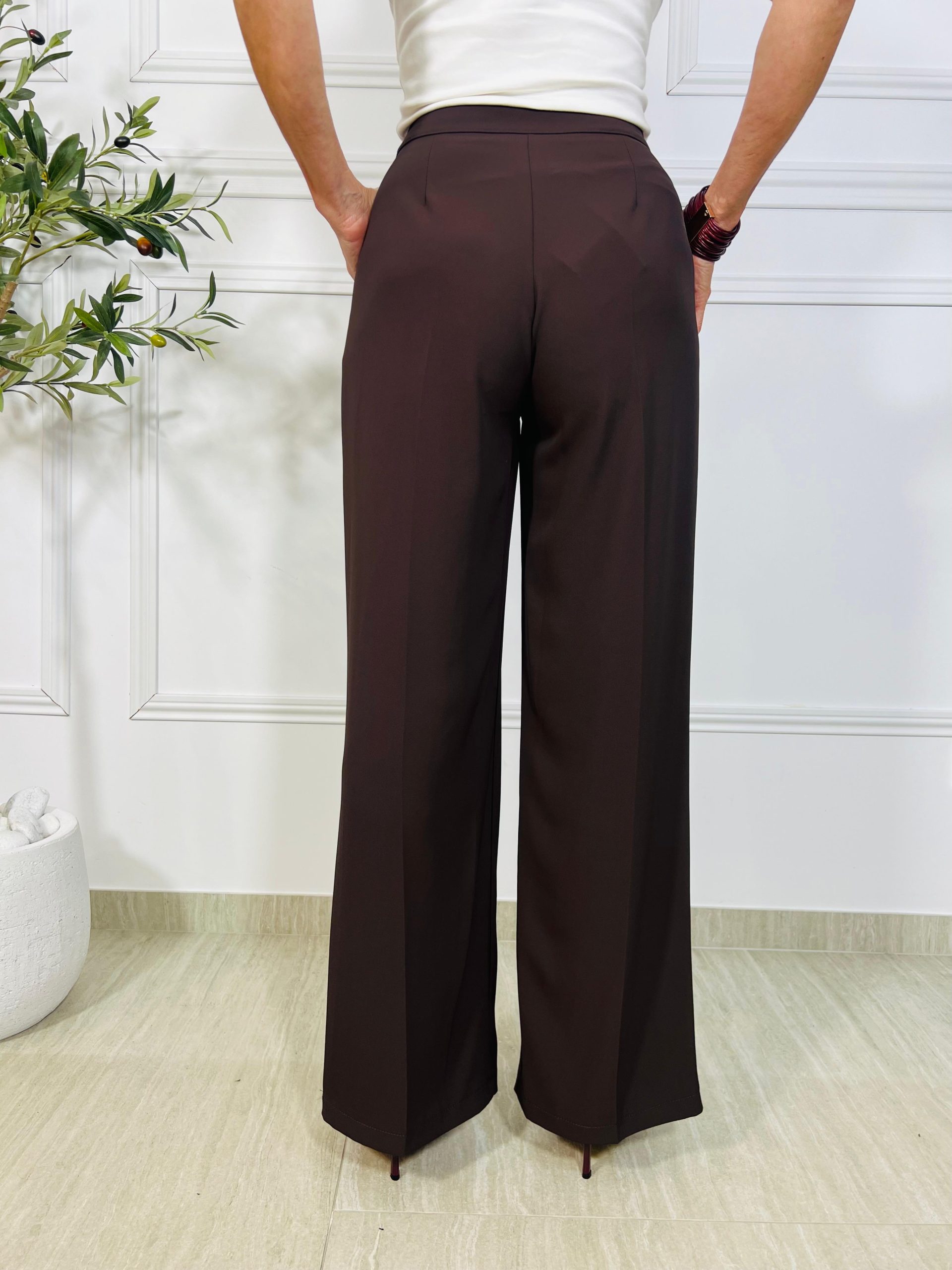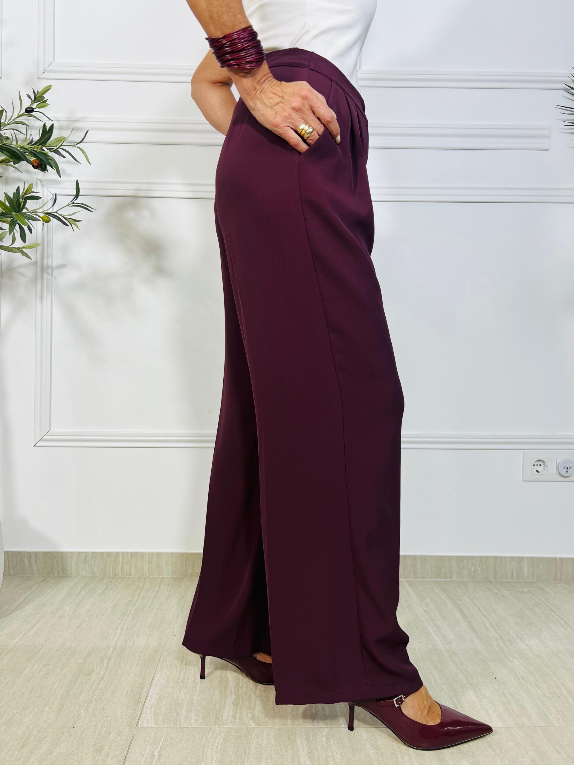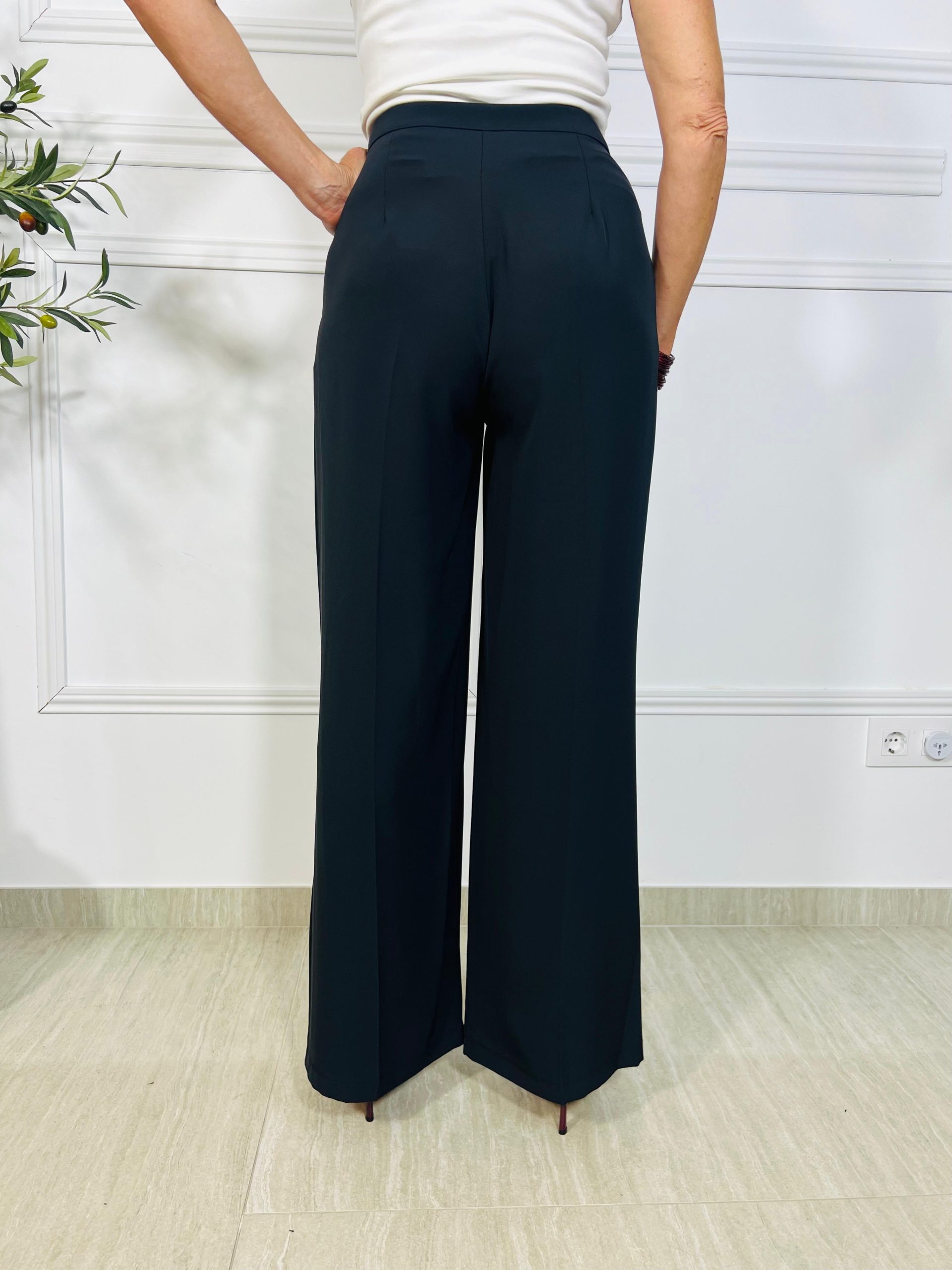 Pantalón con pinzas, con bolsillos laterales, con botón y cremallera, la tela tiene mucha caída.