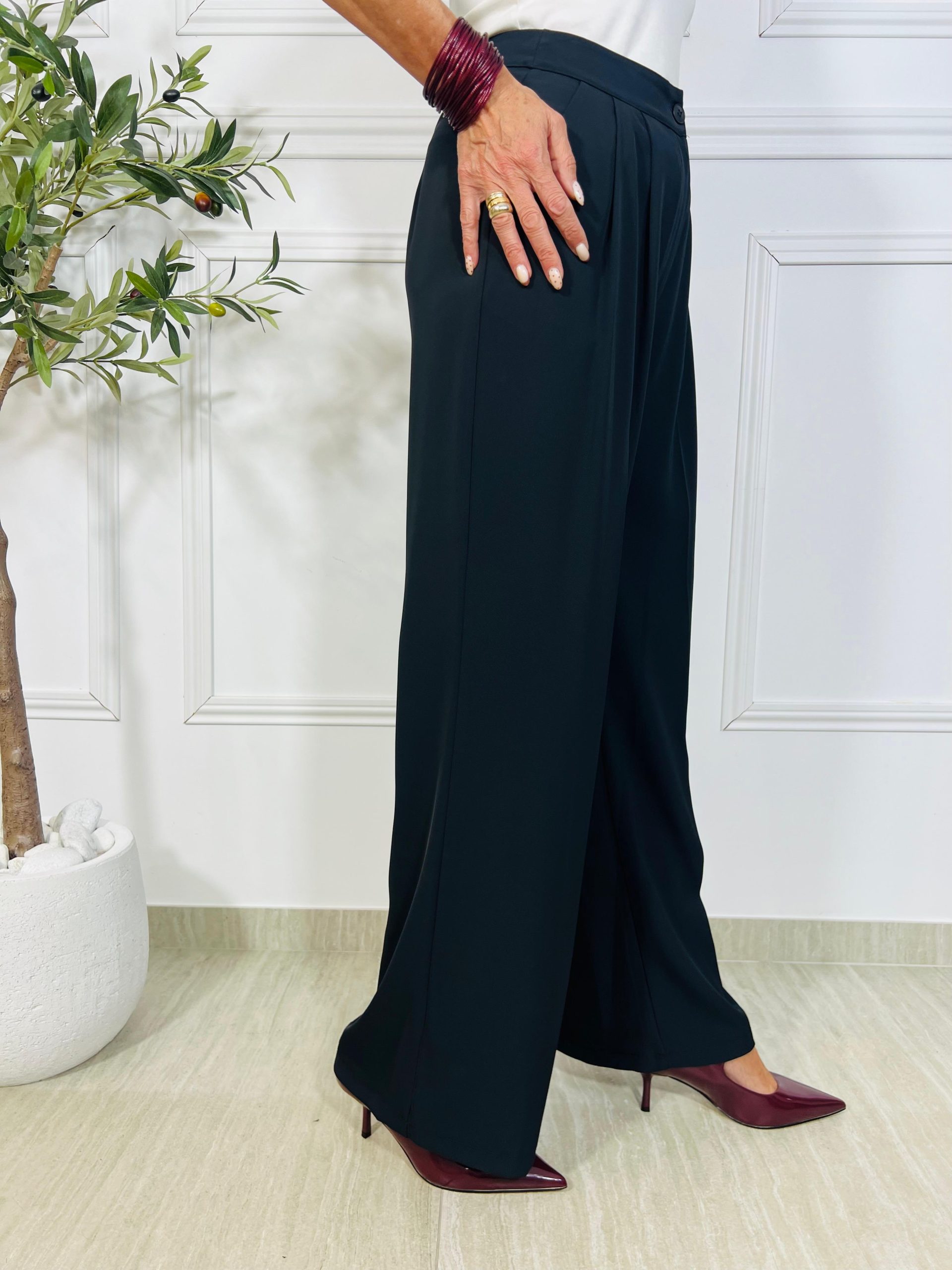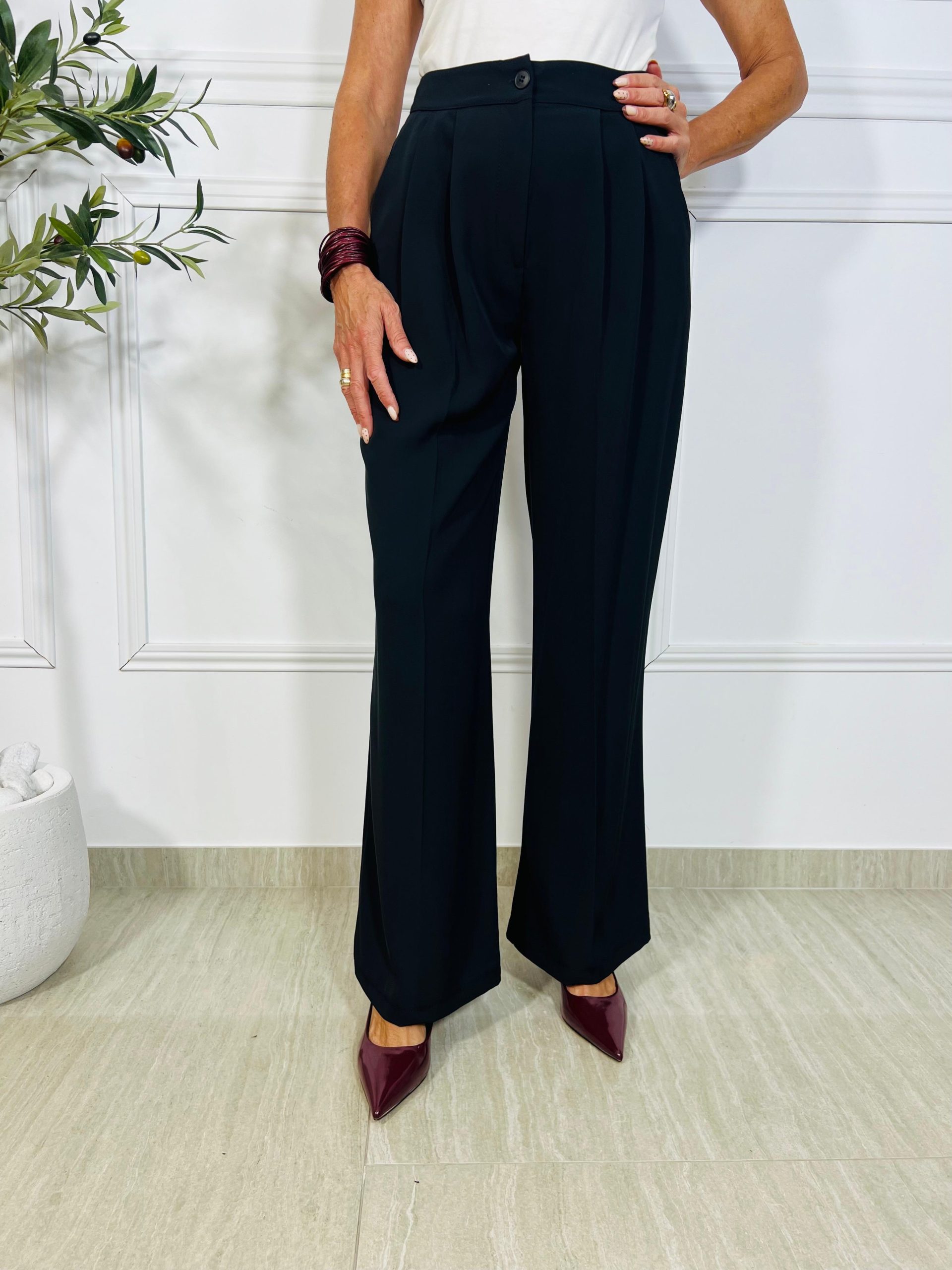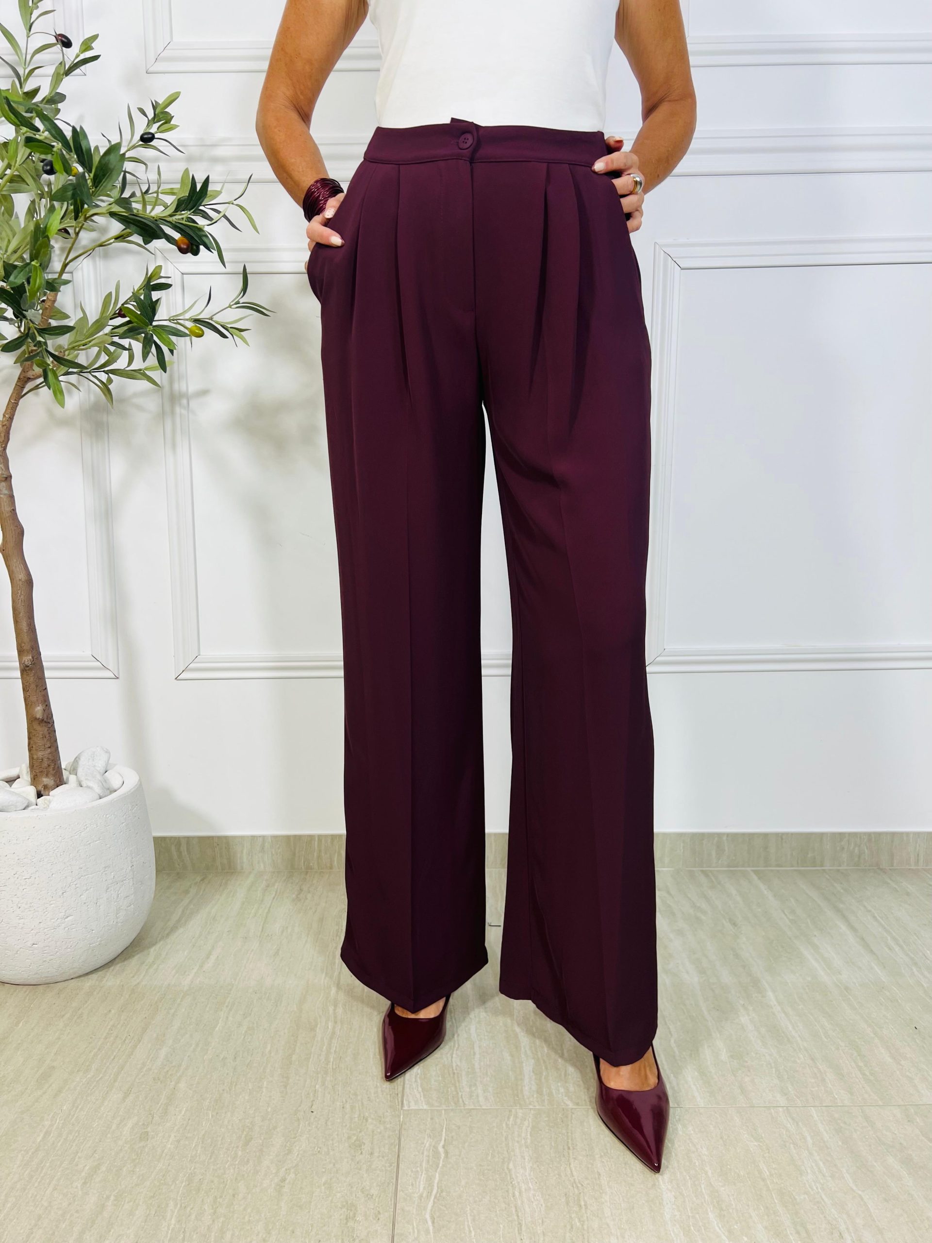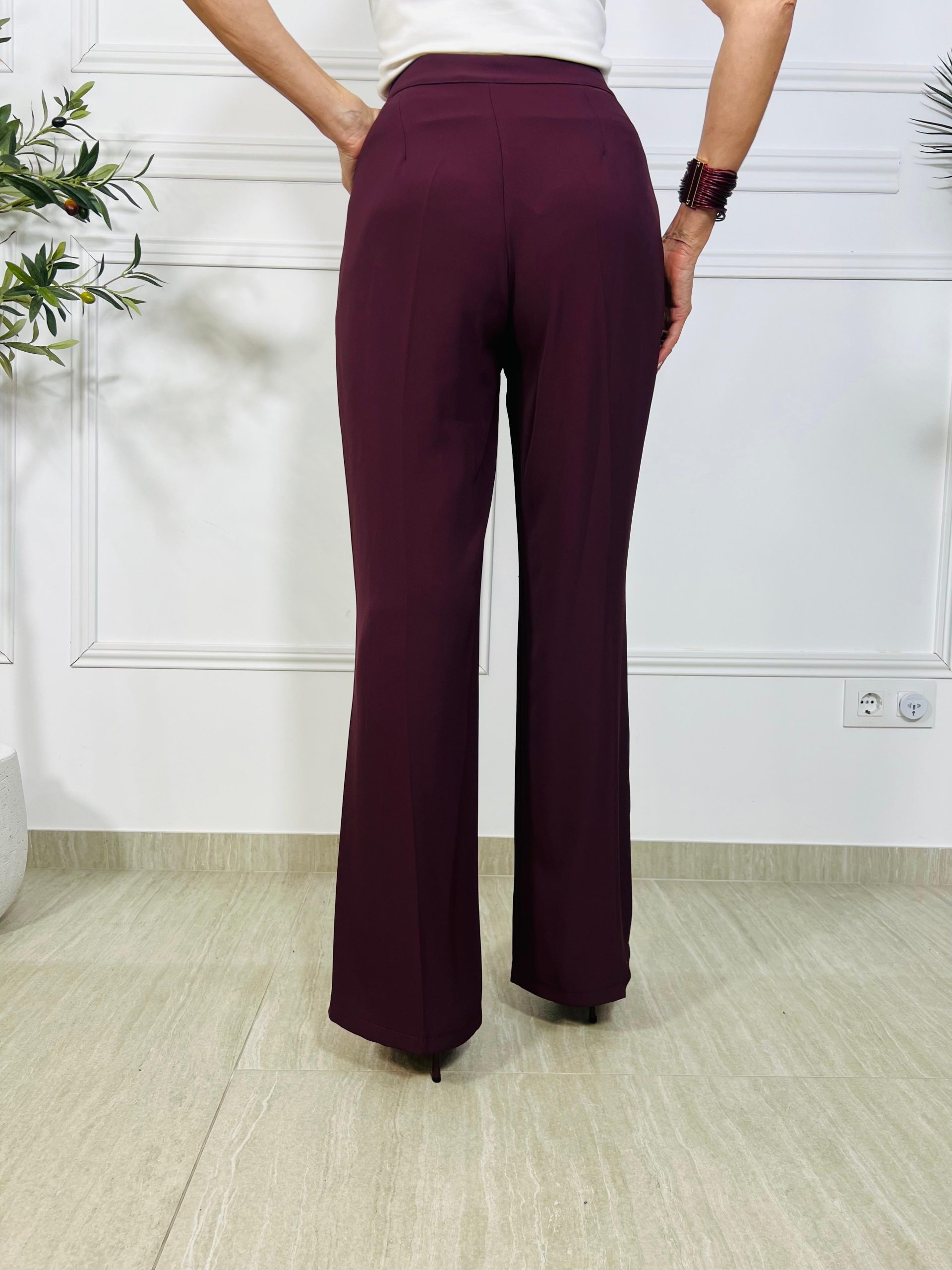 Pantalón con pinzas, con bolsillos laterales, con botón y cremallera, la tela tiene mucha caída.