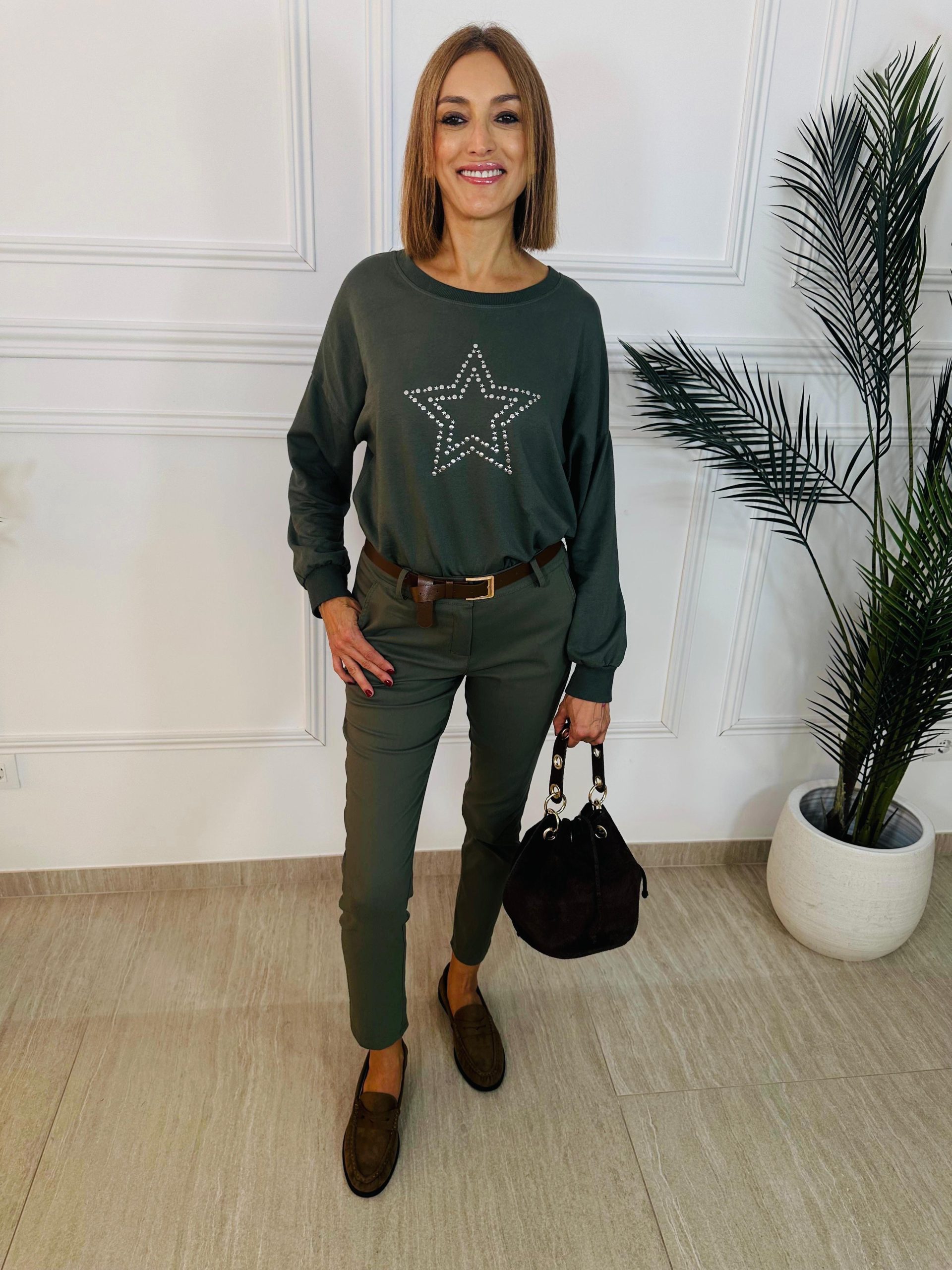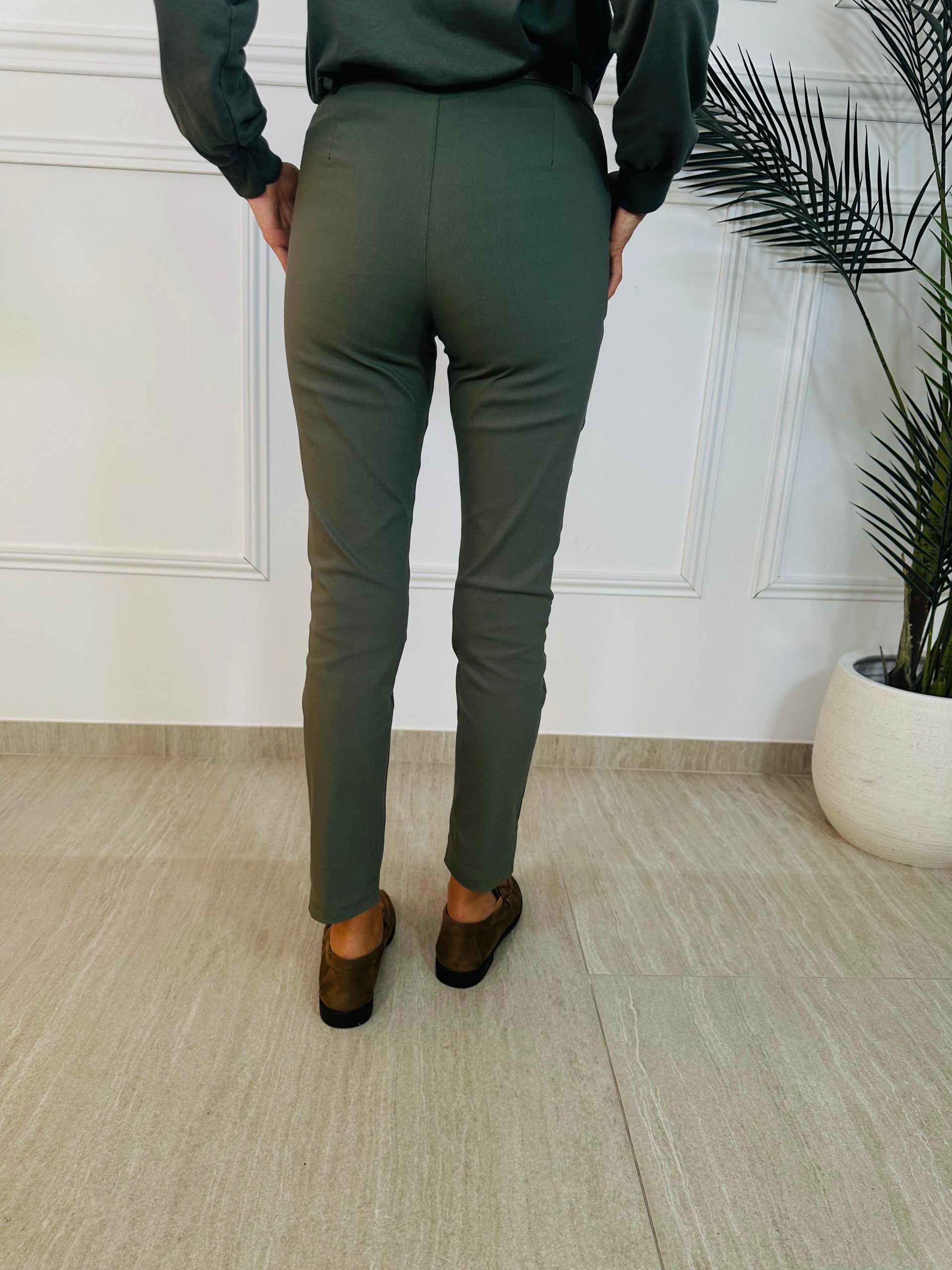 Pantalón de tejido elástico de tiro medio con cinturón incorporado, bolsillos laterales . Cierre frontal con botón y cremallera.