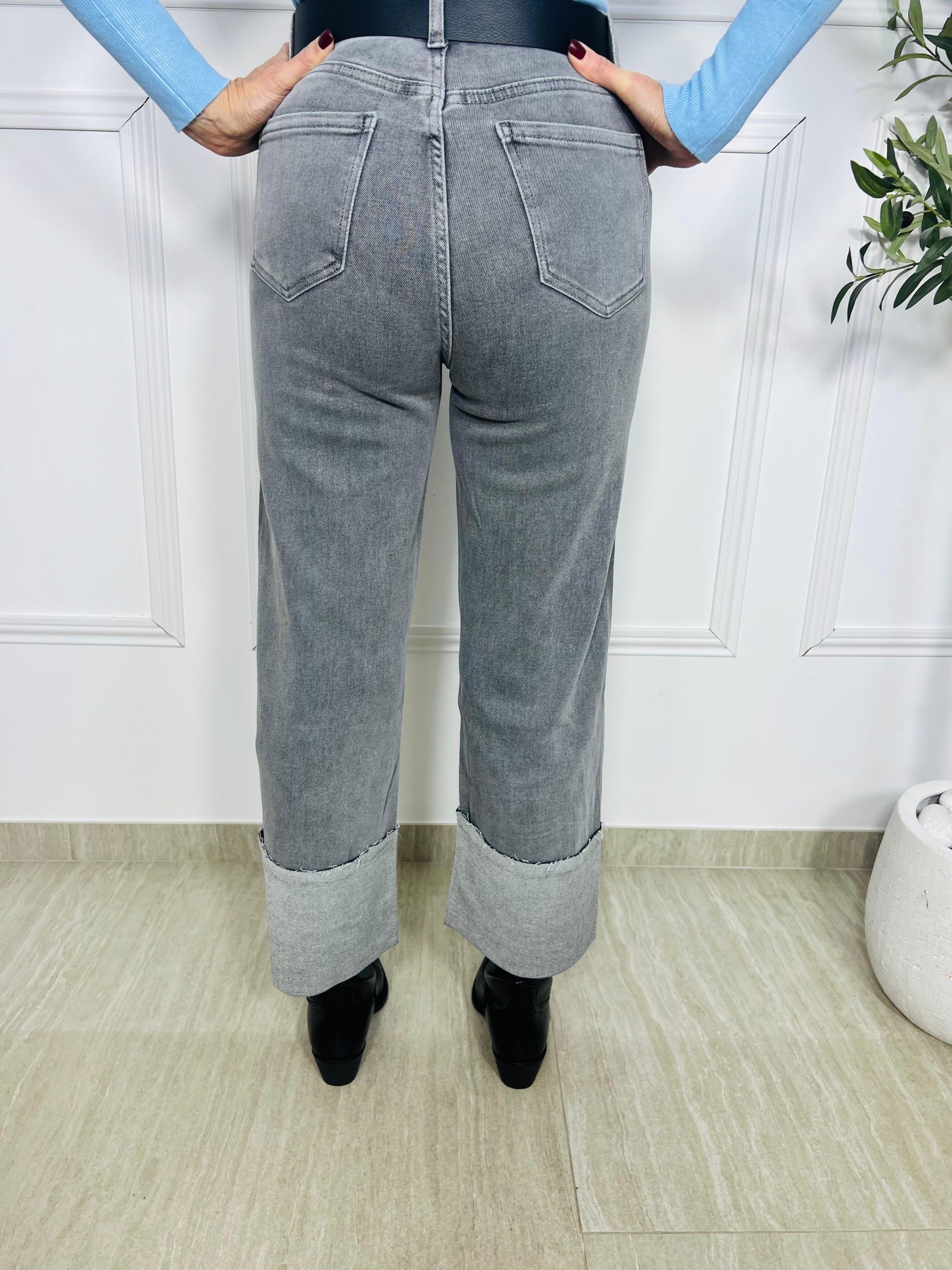 Pantalón gris de corte recto y estilo cropped, confeccionado en denim de alta calidad. Su diseño incorpora delicadas perlas distribuidas de manera uniforme que aportan un toque elegante y sofisticado. Los bajos están ligeramente desflecados y doblados, creando un efecto moderno y casual. Se combina fácilmente con blusas, suéteres o chaquetas, convirtiéndolo en una prenda versátil para cualquier ocasión. Incluye cinturilla con trabillas, cierre de cremallera y botón, ideal para estilizar la silueta.