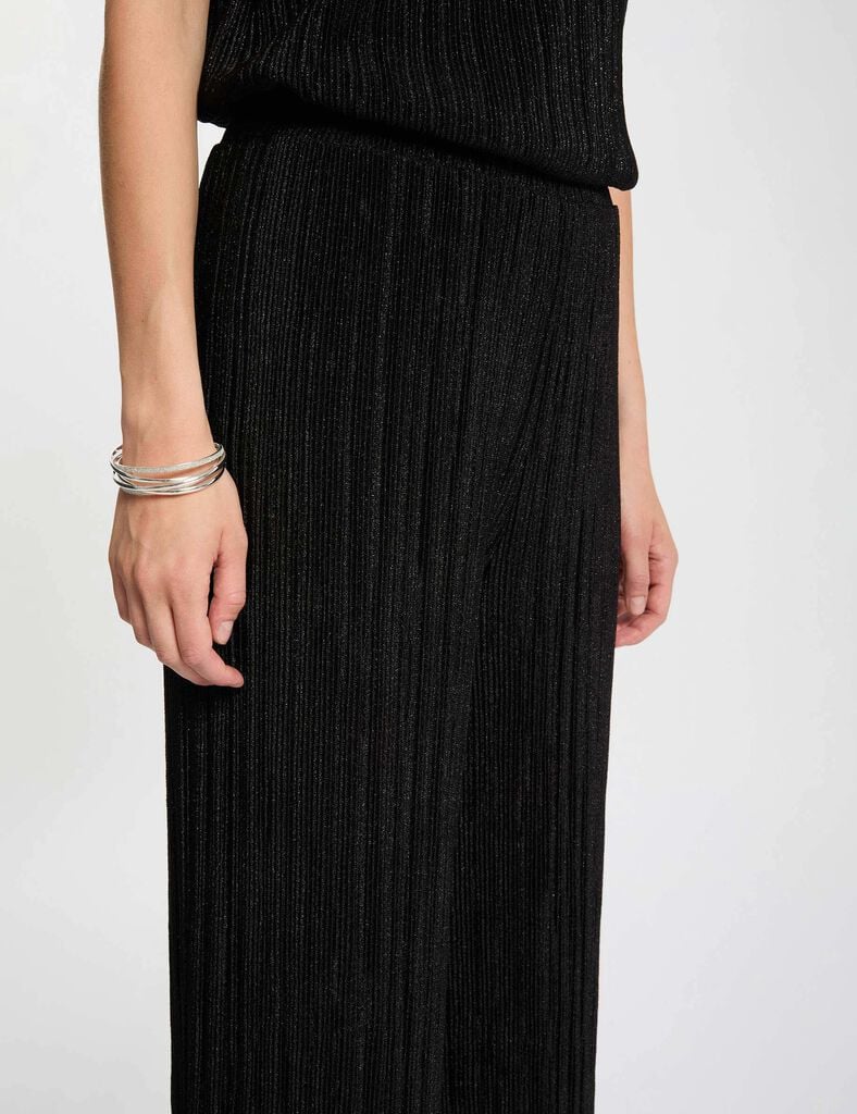 - Este pantalón ancho encarna una elegancia sofisticada gracias a su delicado plisado, un verdadero detalle de tendencia. Su corte amplio realza la silueta con modernidad y se adapta armoniosamente a todas las morfologías. Una prenda imprescindible para un estilo refinado en el día a día.