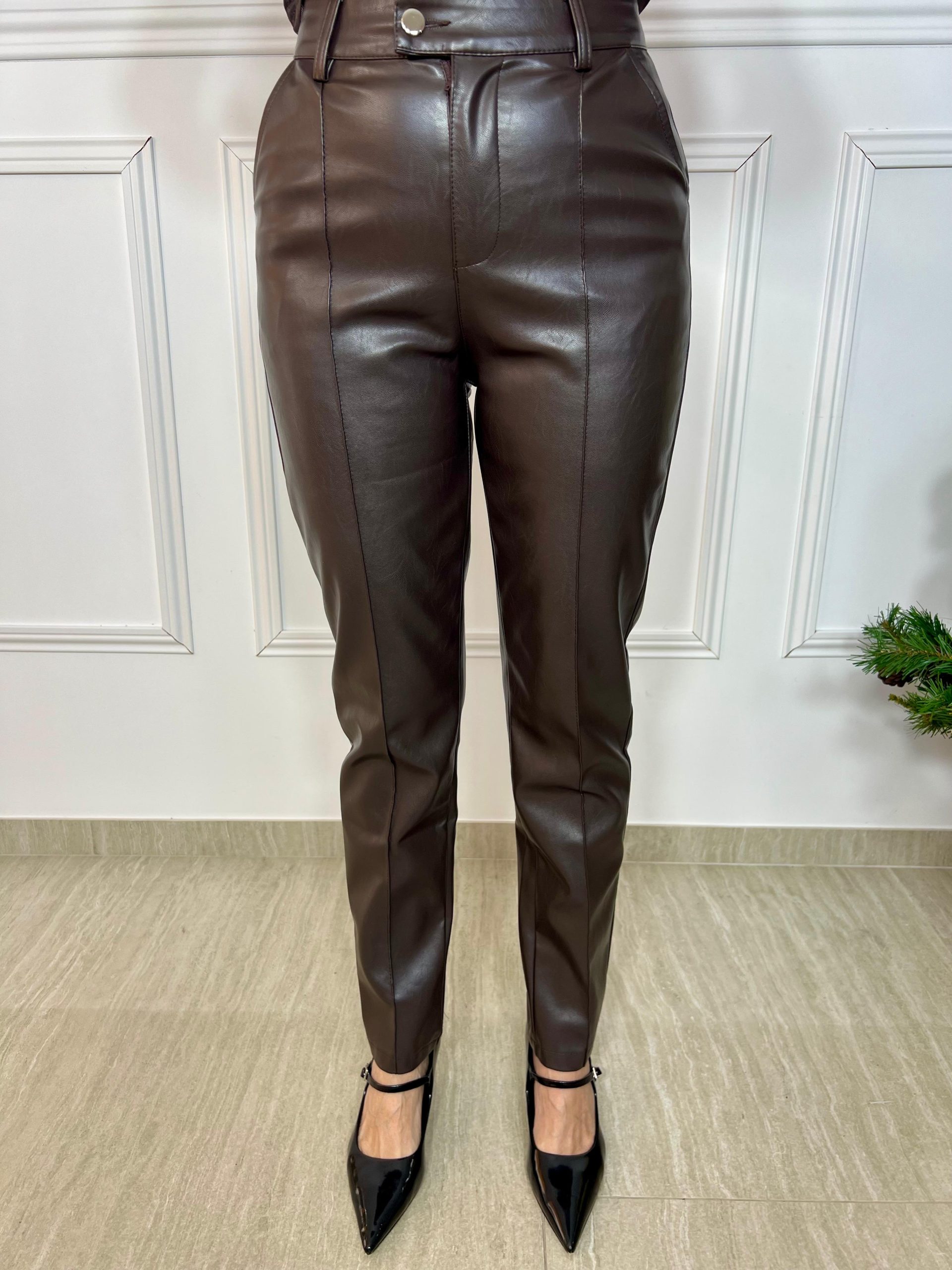 Pantalones de polipiel color chocolate con corte estrecho tipo pitillo, que estilizan la silueta y aportan un look moderno y sofisticado. Se abrochan con un botón metálico color champán y cuentan con bolsillos delanteros tipo chino y falsos bolsillos traseros de decoración, que añaden detalle sin perder funcionalidad. Una prenda versátil, ideal para combinar con camisetas, blusas o chaquetas y crear conjuntos elegantes y actuales.