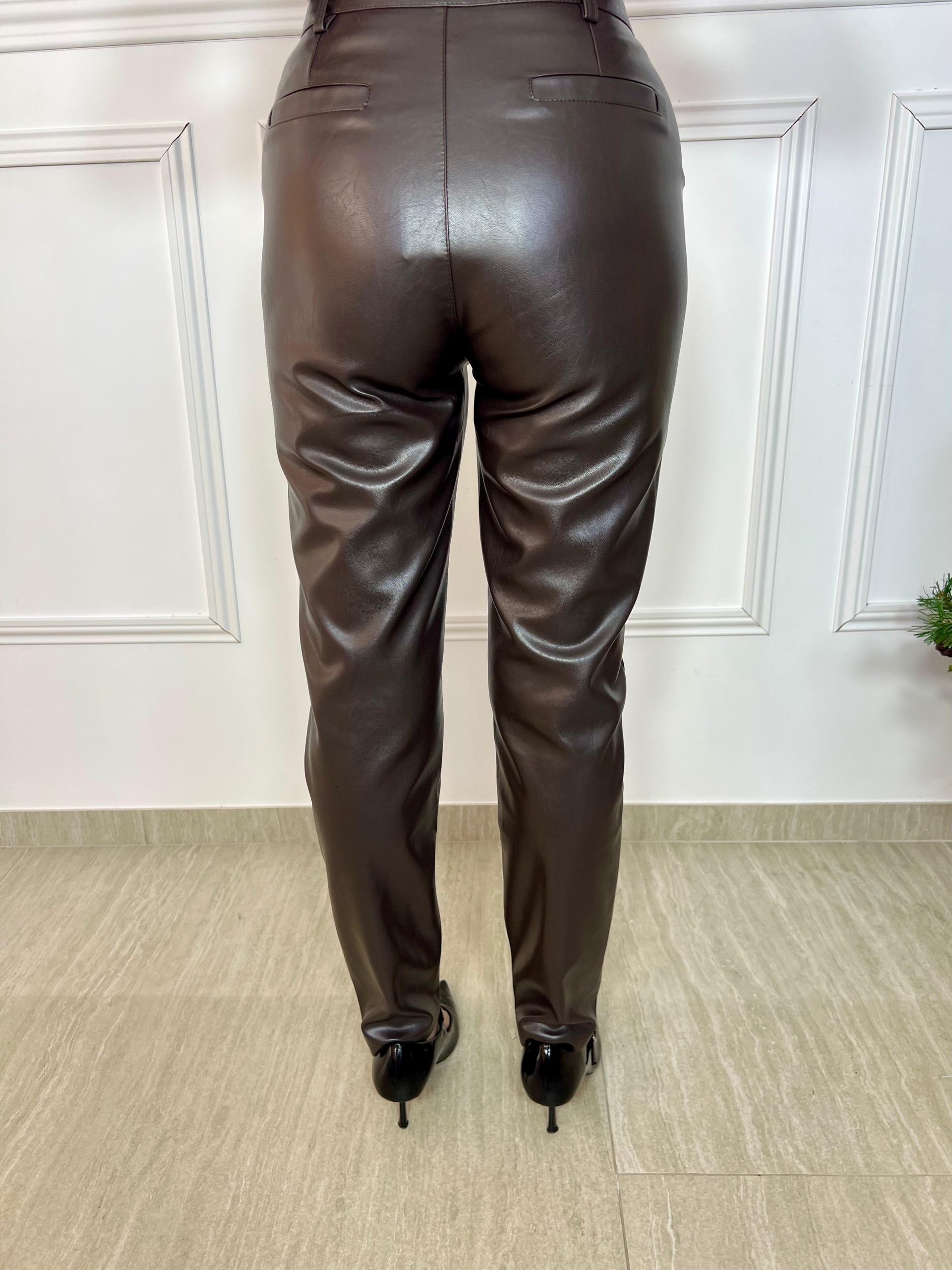 Pantalones de polipiel color chocolate pitillo con bolsillos tipo chino delanteros y falsos bolsillos traseros. Botón metálico champán. Modernos