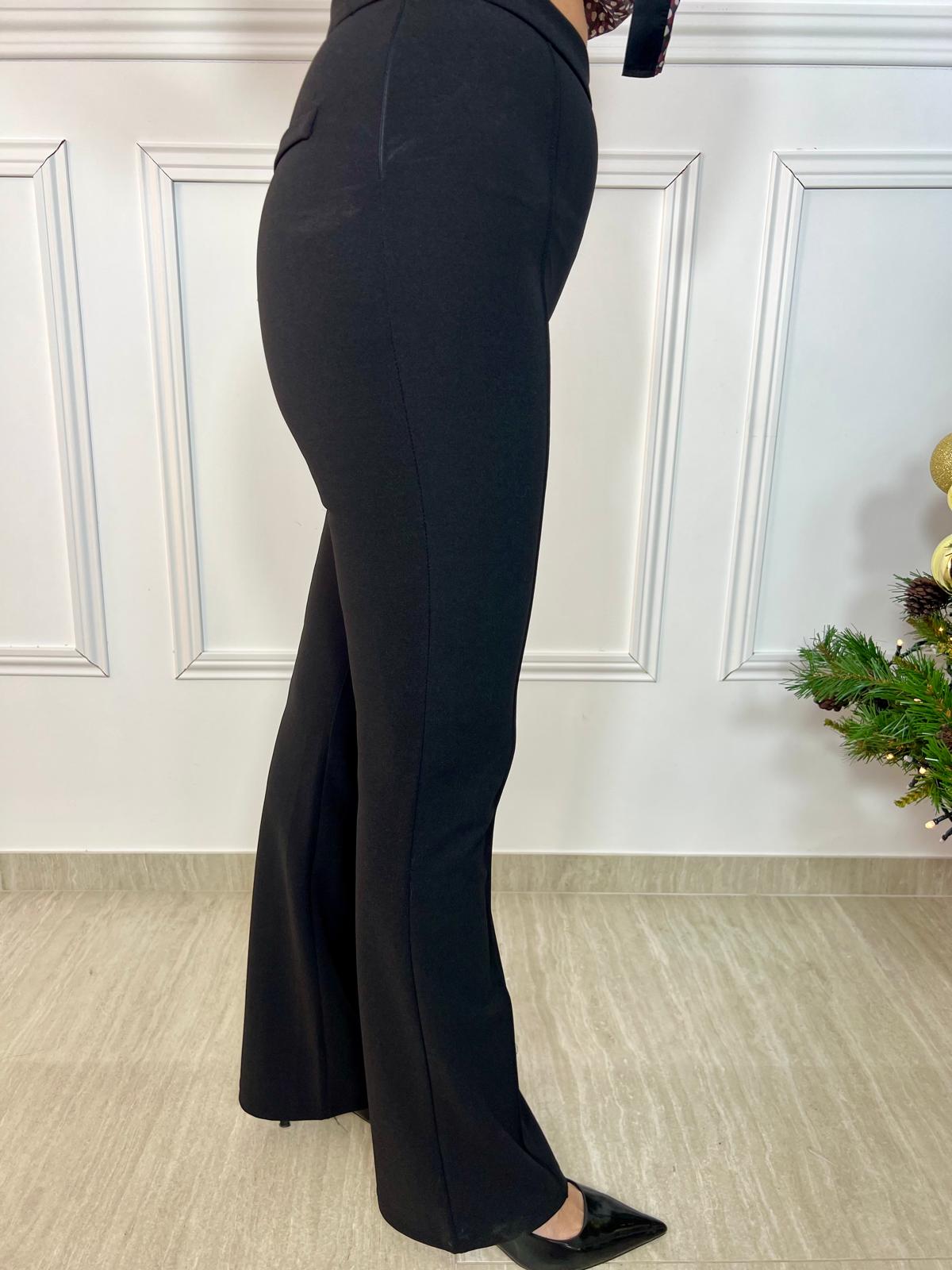 Pantalones flare con un diseño favorecedor que estiliza la silueta. Se abrochan con cremallera lateral, aportando un acabado limpio y elegante, y cuentan con bolsillos traseros falsos de carácter decorativo. Confeccionados en un tejido muy elástico, resultan especialmente cómodos y se adaptan perfectamente al cuerpo. Unos pantalones versátiles, ideales tanto para looks de diario como para opciones más arregladas.