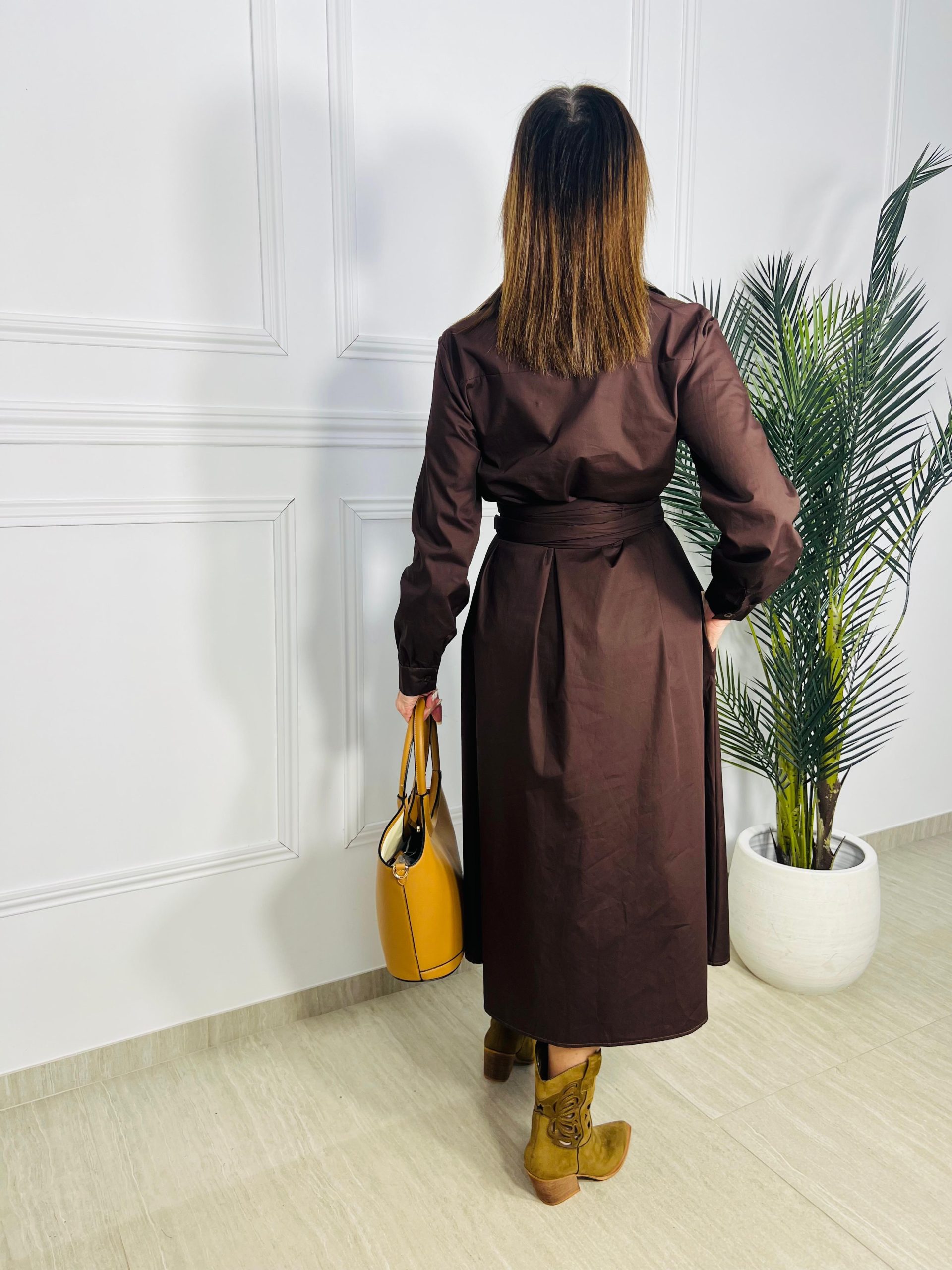 Eleva tu armario con el Vestido Camisero Sahara Mid, ahora en un profundo y elegante marrón chocolate. Este diseño de largo midi destaca por su corte impecable y su tejido con caída, que aporta una estructura profesional y femenina a la vez.