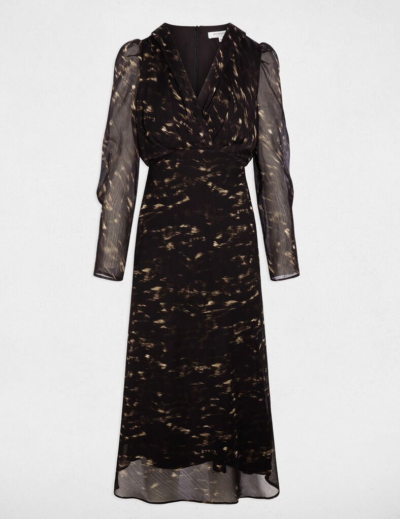 Este vestido cruzado de largo 3/4 combina modernidad y feminidad con su corte recto fluido. Las mangas abullonadas aportan un aire sofisticado, mientras que el velo transparente añade una delicadeza sutil al estilo. La cintura se realza elegantemente con el cinturón cruzado, para un efecto muy refinado. Largo 3/4FluidoCorte recto. Escote en V. Mangas largas. Cruzado Velo