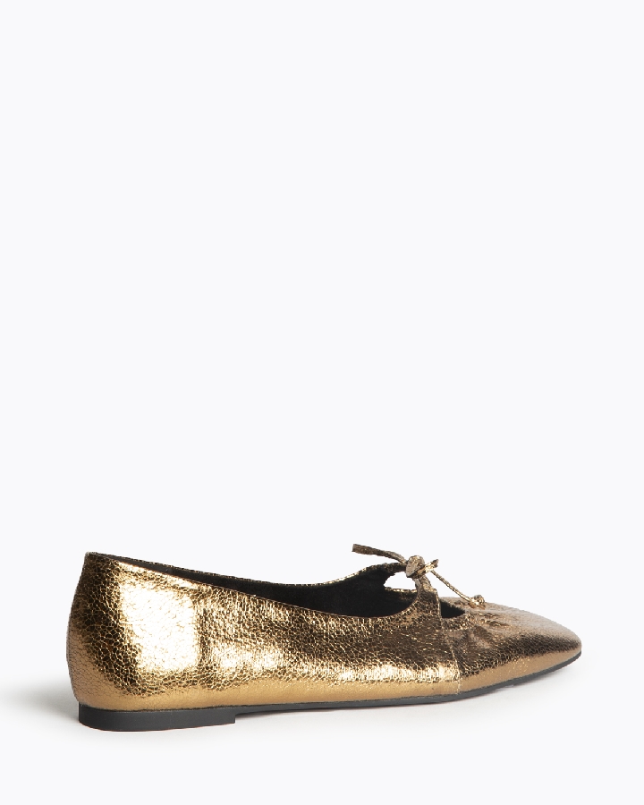 Zapato plano tipo bailarina, ajustable en la parte delantera con lacito, color bronce. acabado en punta redonda.