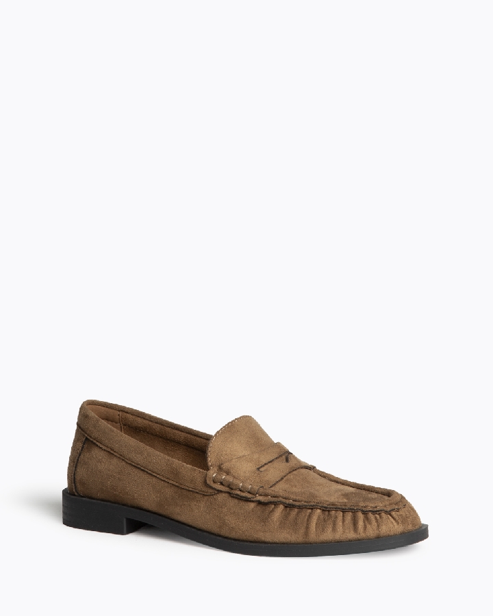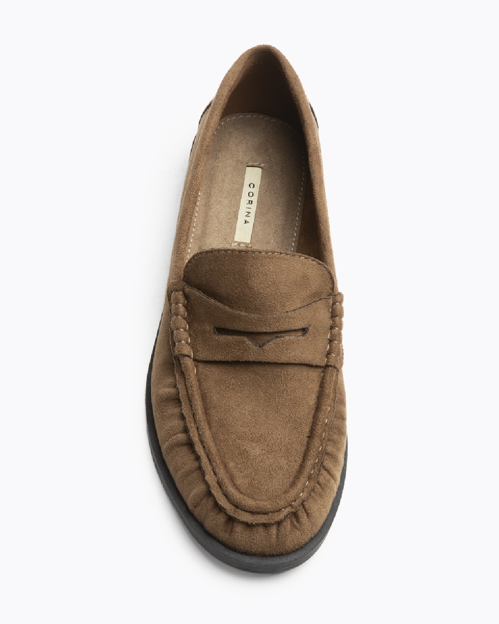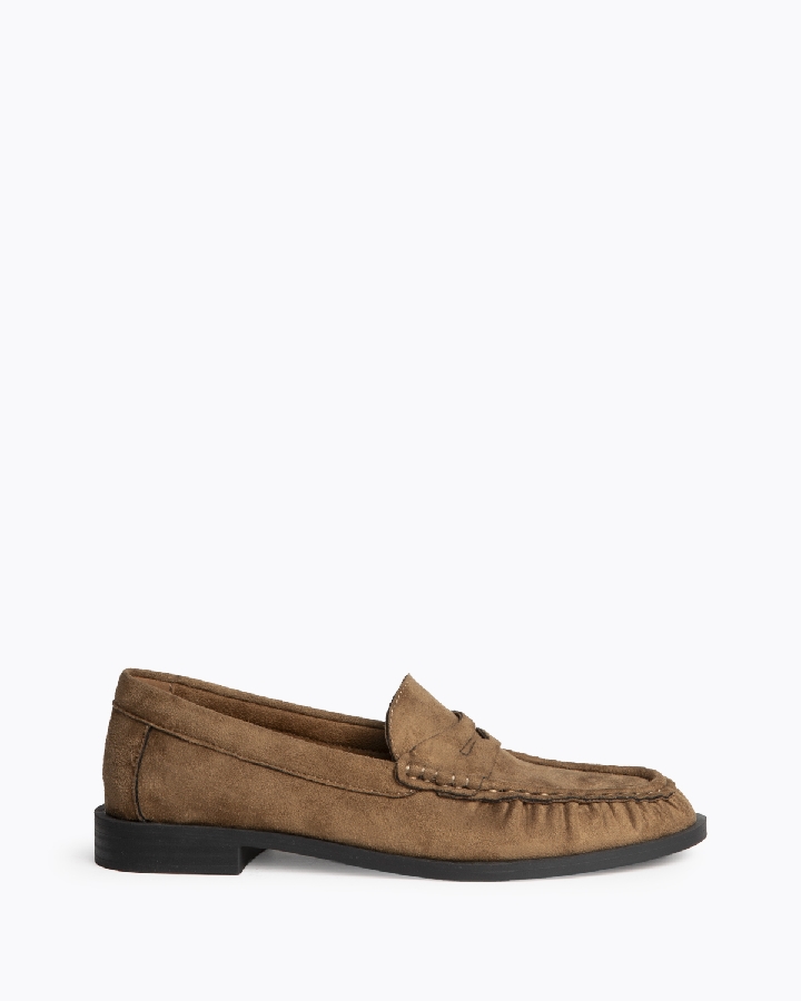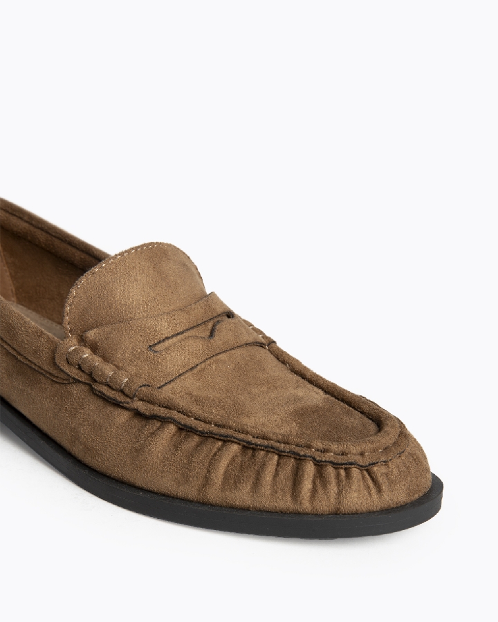 Zapato plano tipo mocasín en serraje color camel. Detalle pespuntes delanteros. Suela efecto madera
